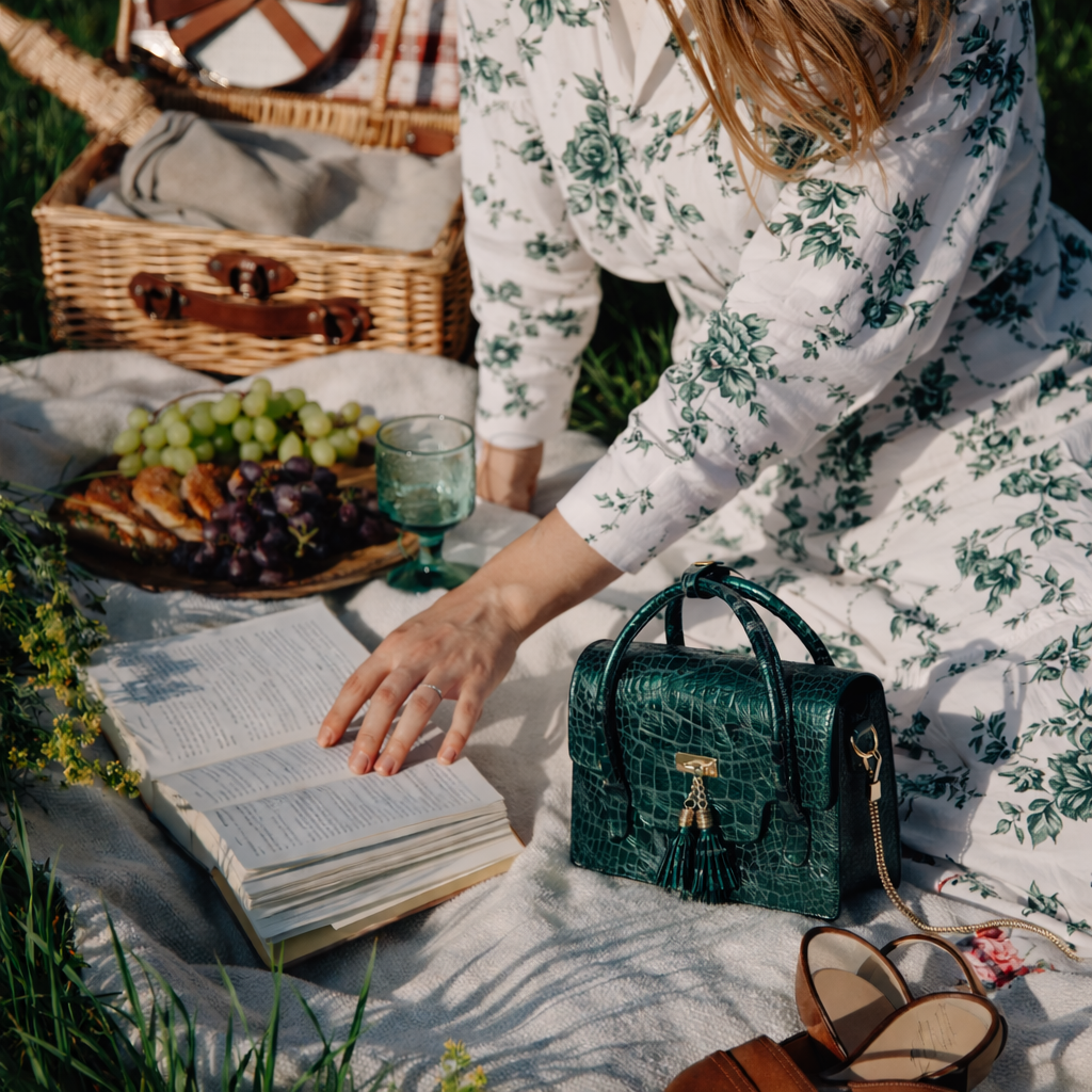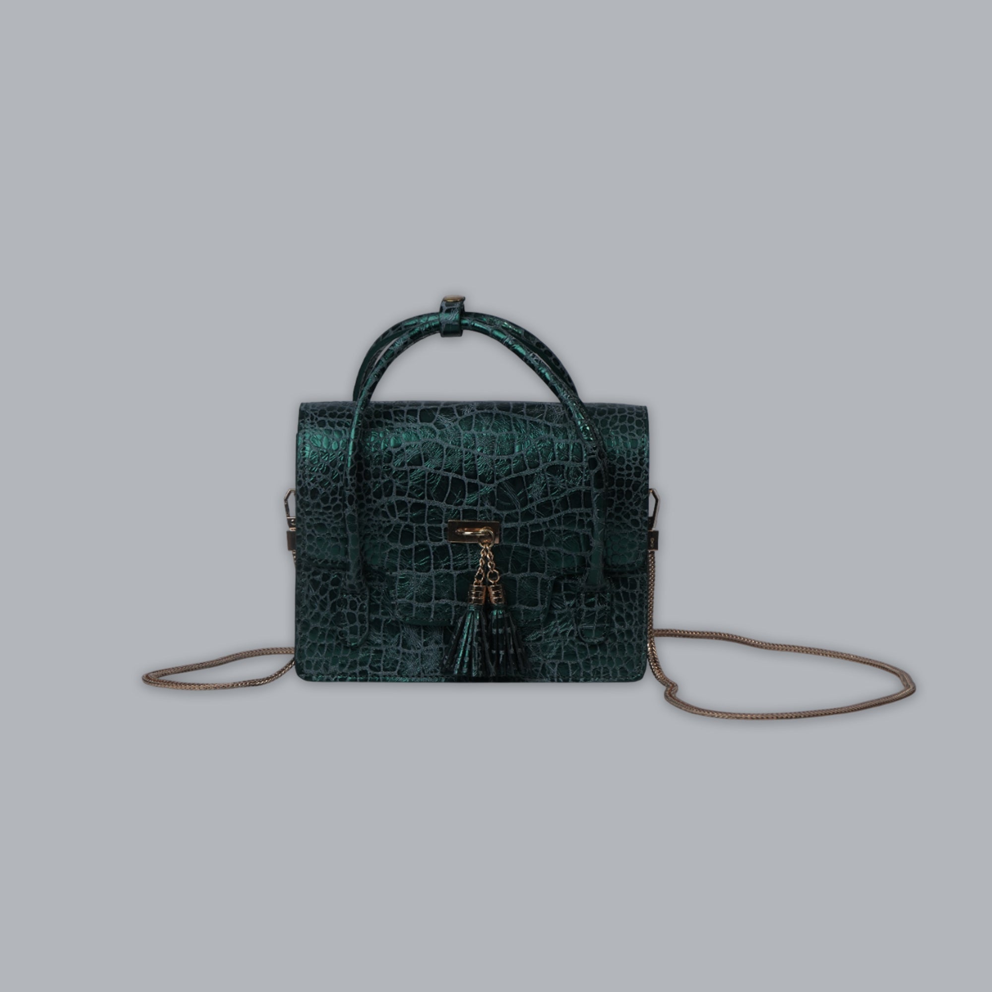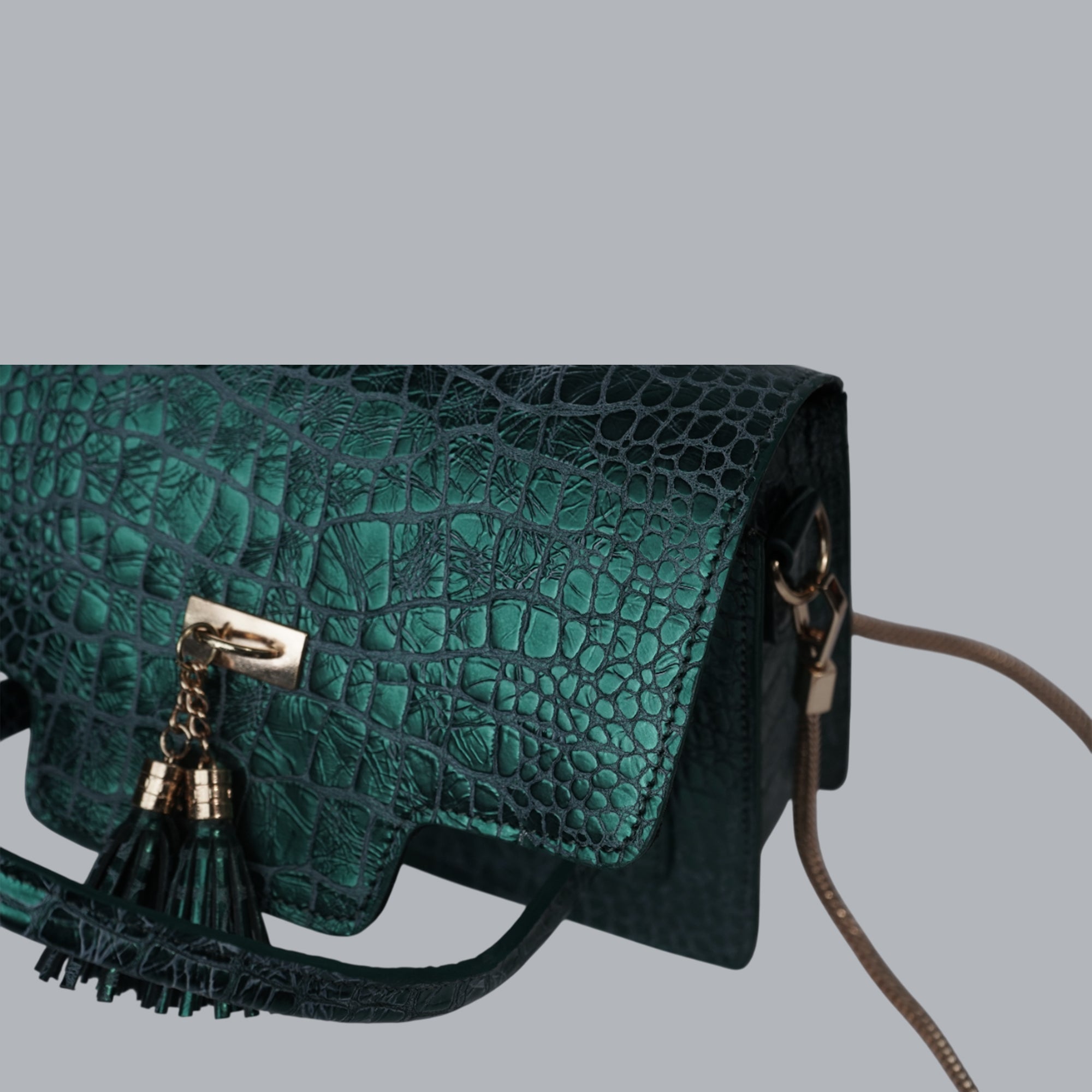 Maxine Green Croc is luxury turned up to maximum drama—an emerald statement piece that refuses to blend in. The high-gloss croc texture catches light like wet lacquer, the silhouette is sculpted and powerful, and the tassel detail adds just the right touch of movement. This is the kind of bag that belongs in first rows, velvet ropes, and backseat conversations in a darkened car. It’s not just a bag; it’s a presence.