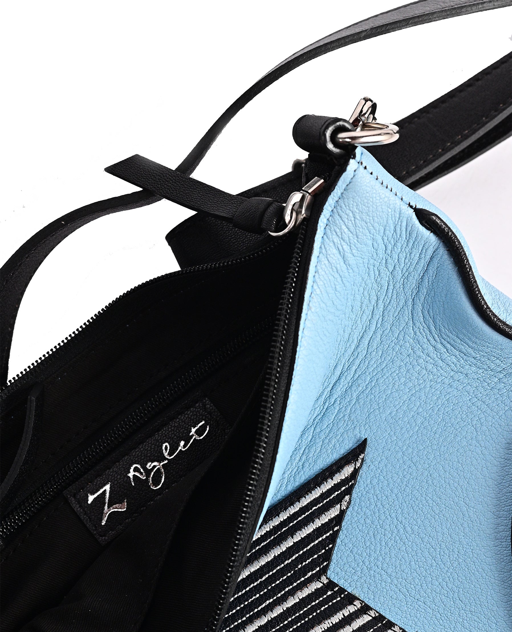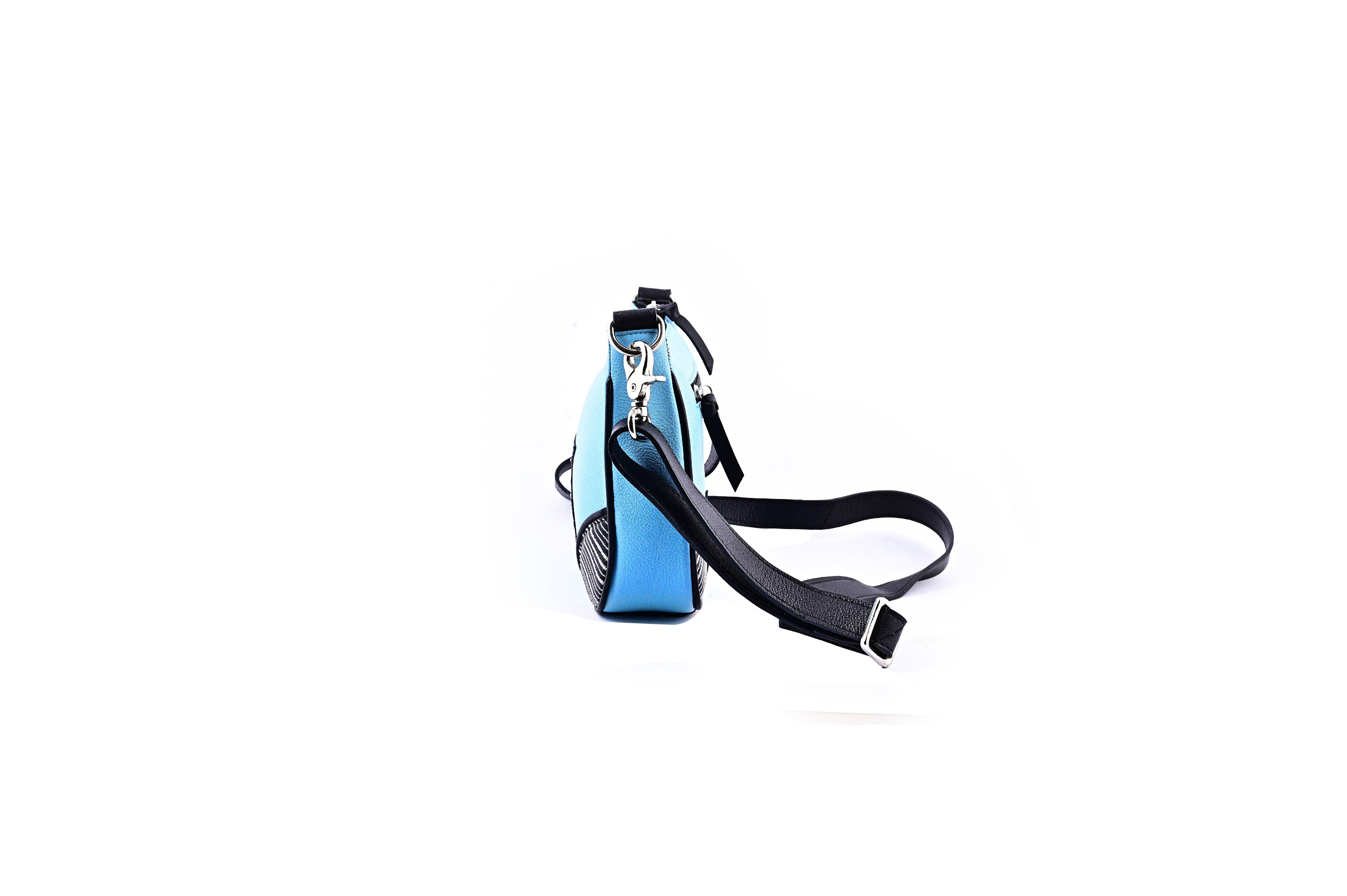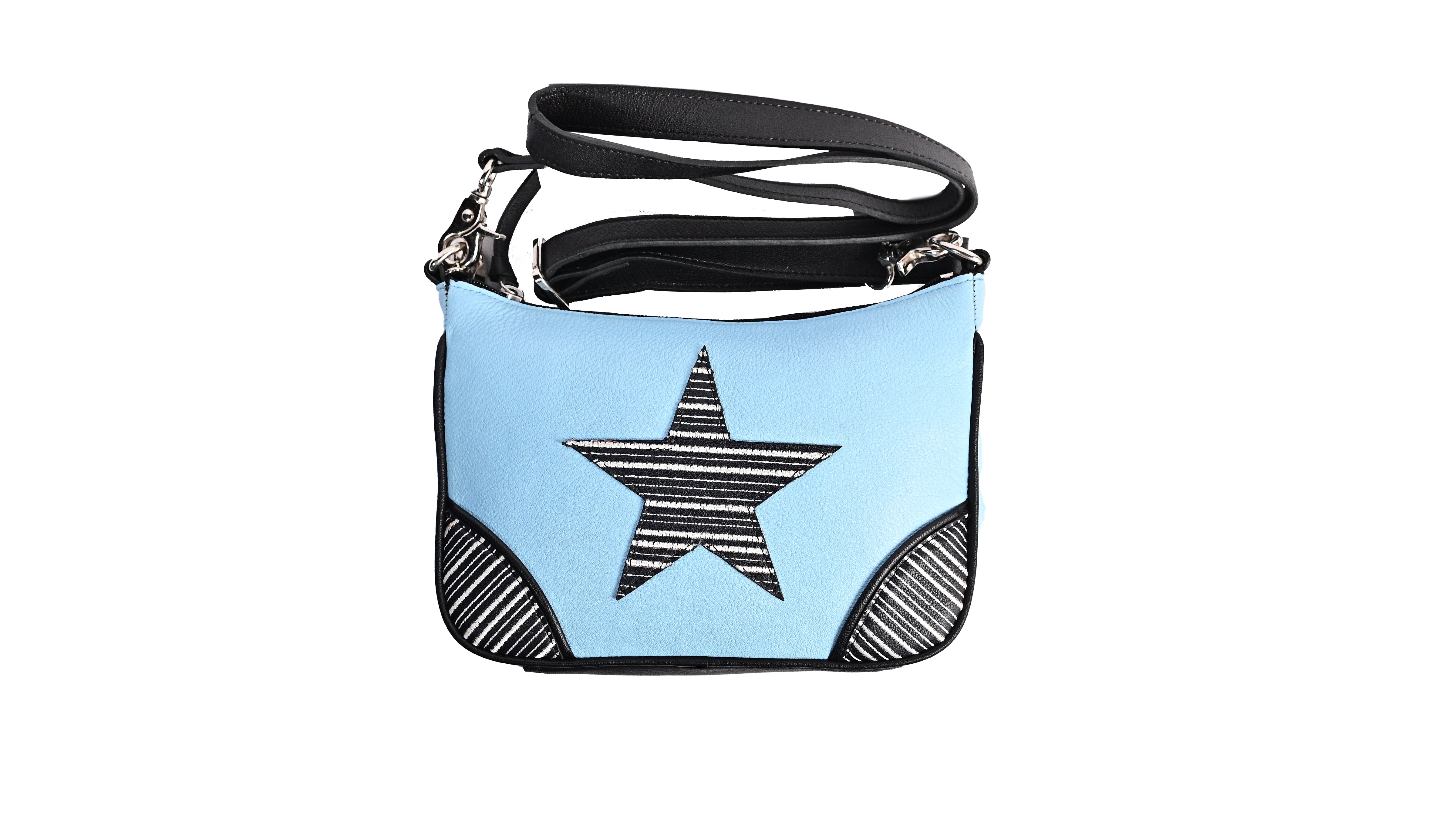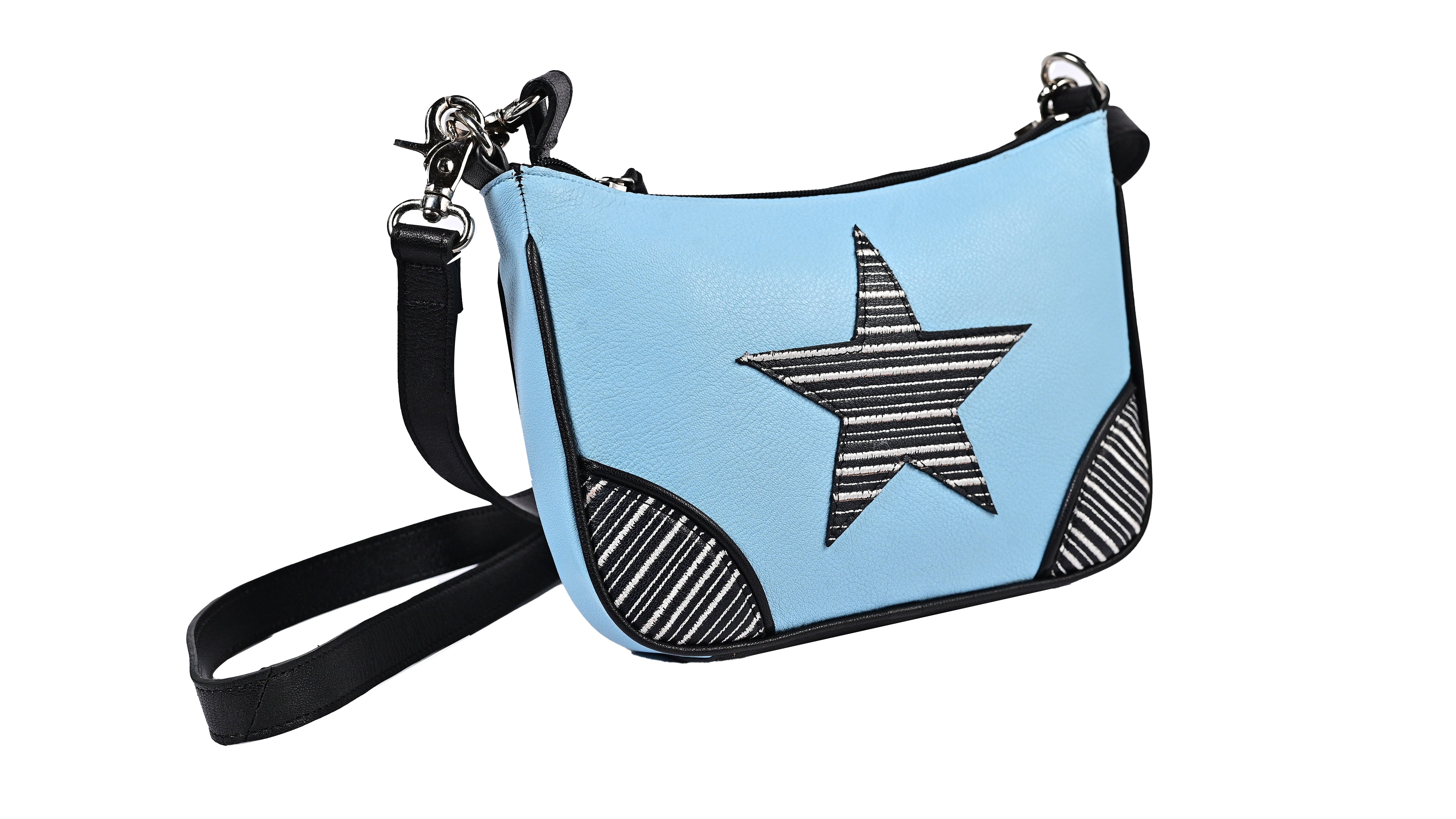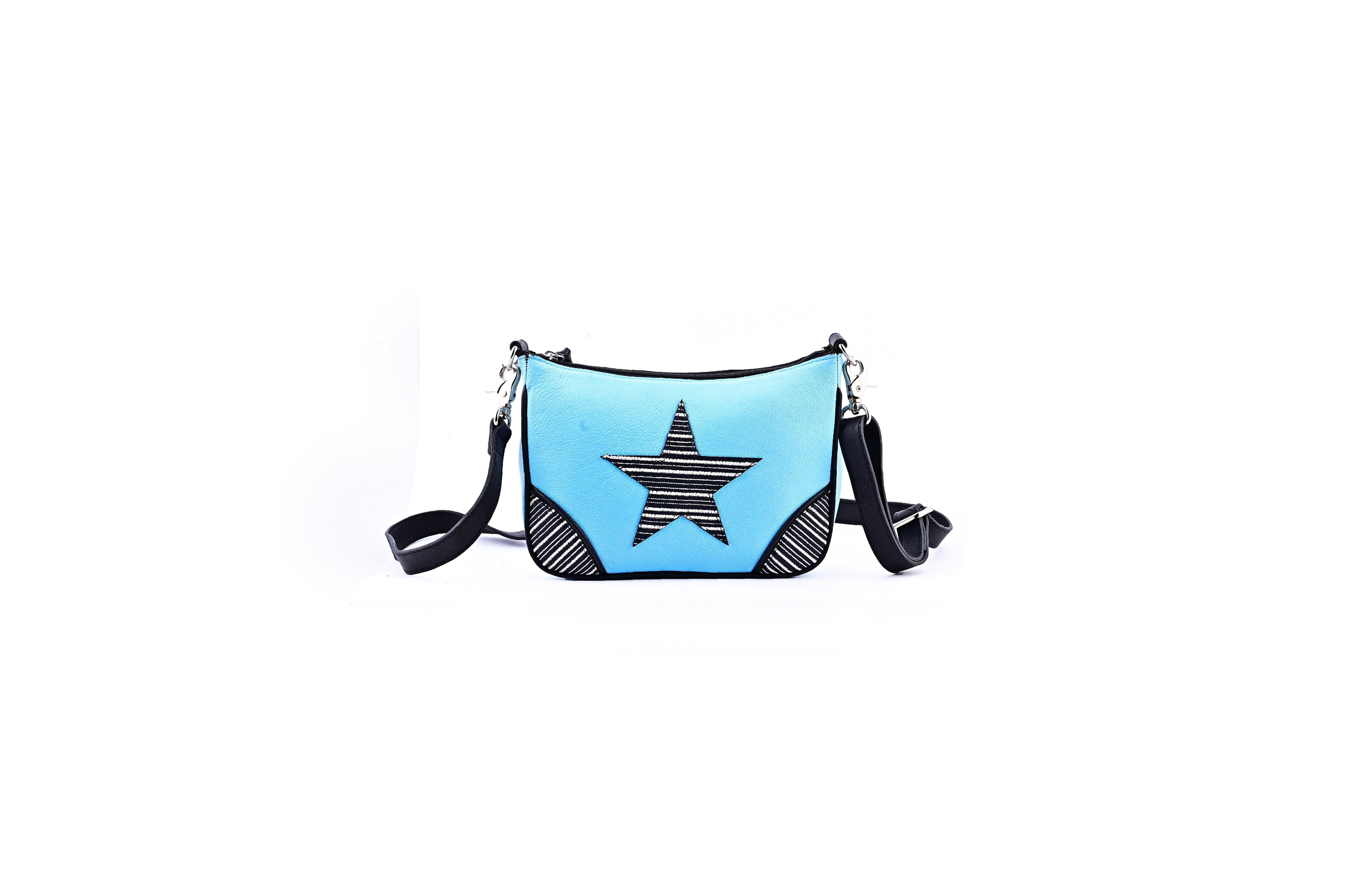 A burst of sky-blue swagger with monochrome striped accents and a bold star that does all the talking. Compact, clever, and wide-open on style — this is your everyday show-stealer disguised as a mini sling. Perfect for days you want to keep it light and nights you want to keep it iconic.