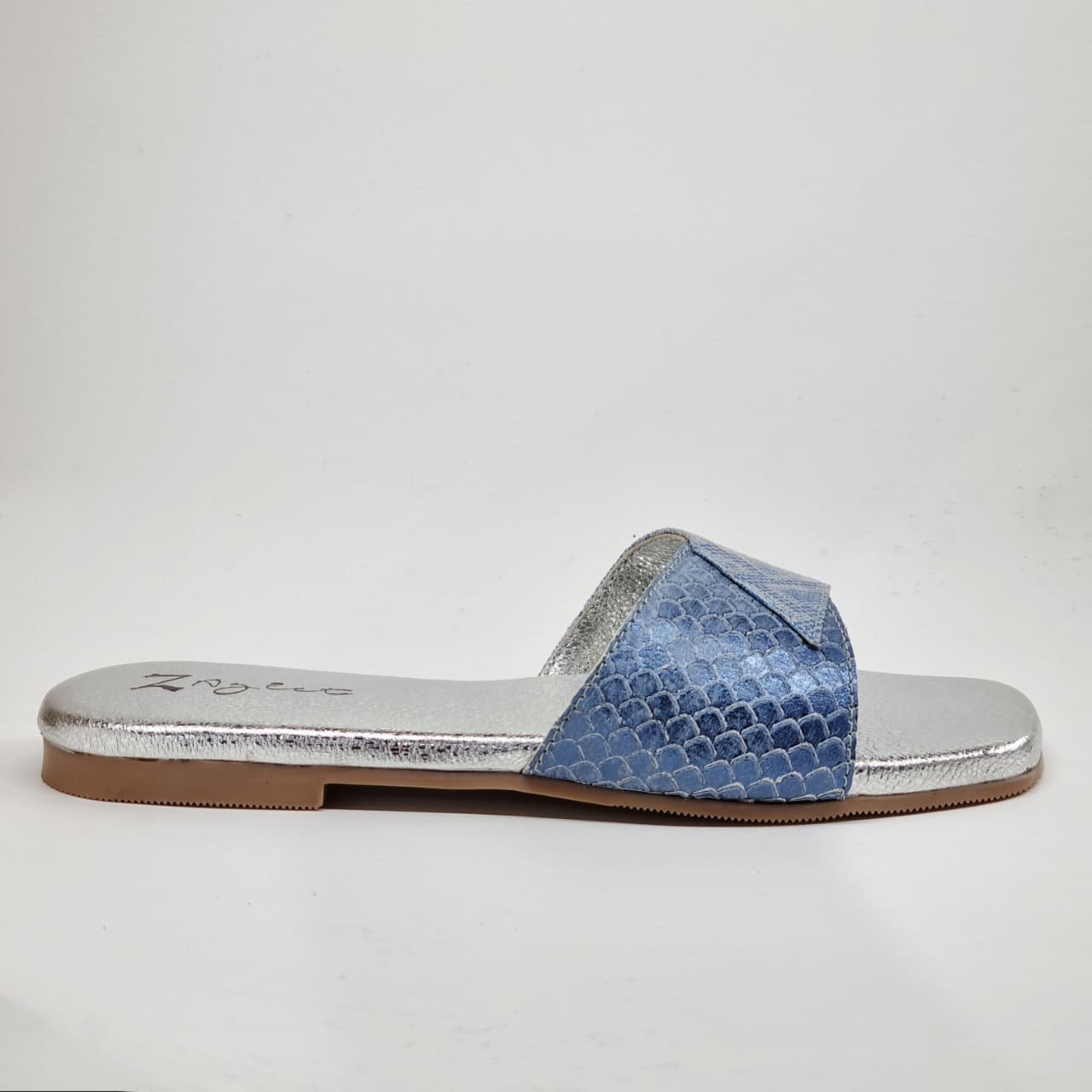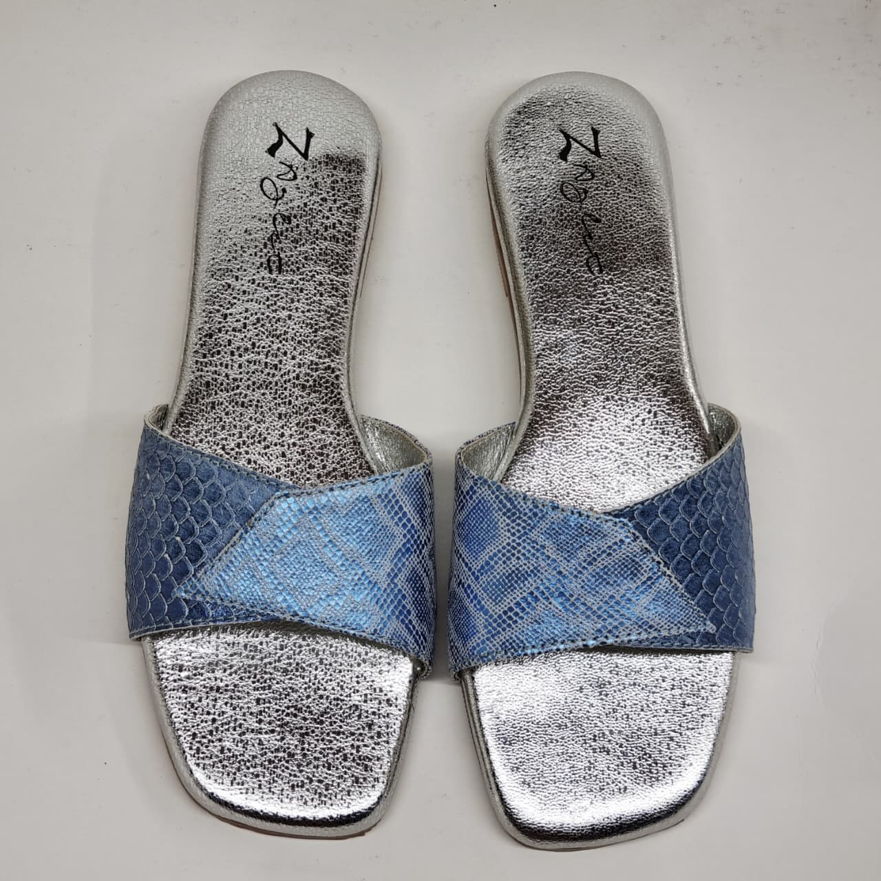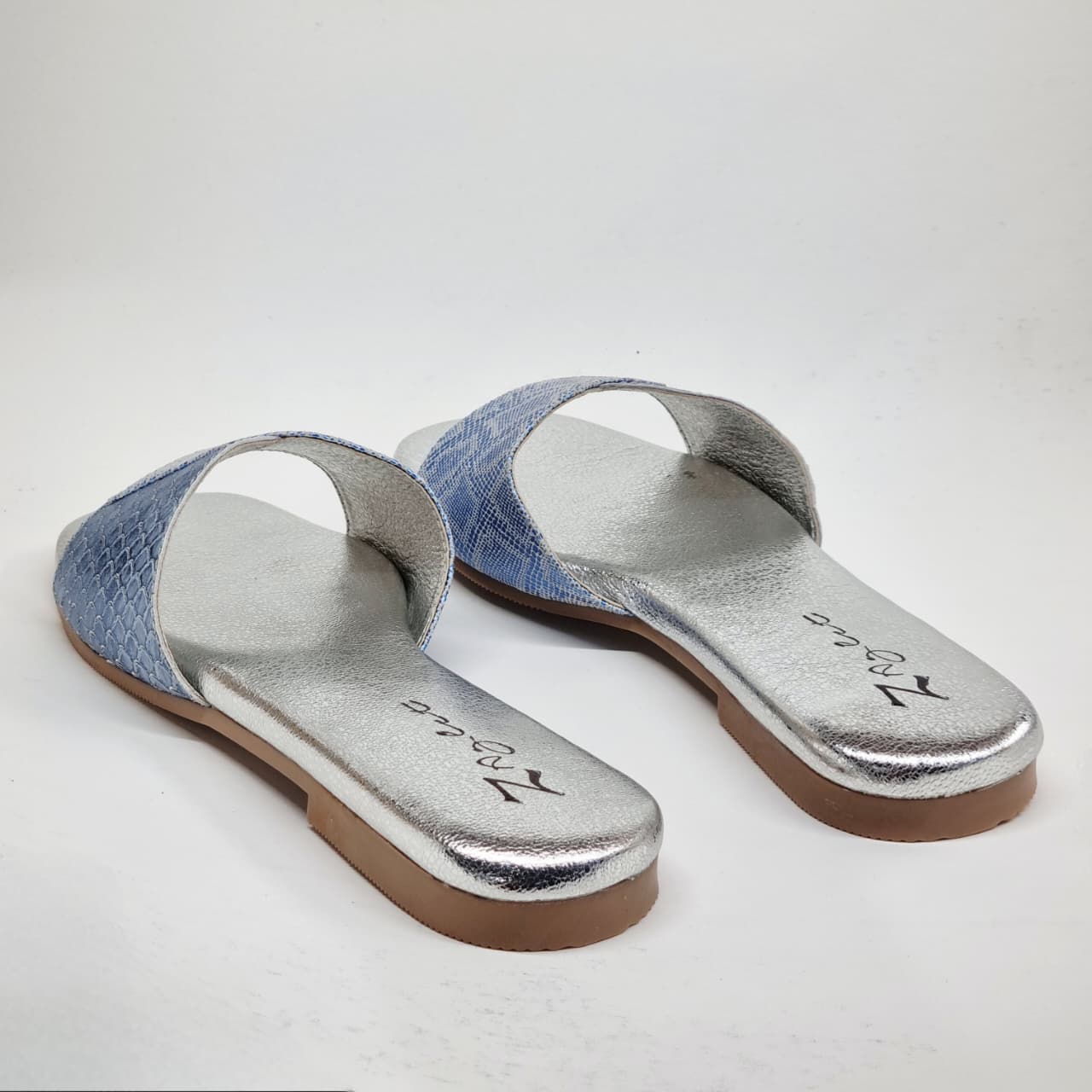 Pure leather slip-on in soft silver with icy blue embossed detail — light-catching, hand-finished, and unapologetically chic. Effortless luxury for days that call for quiet shimmer and lasting impression.