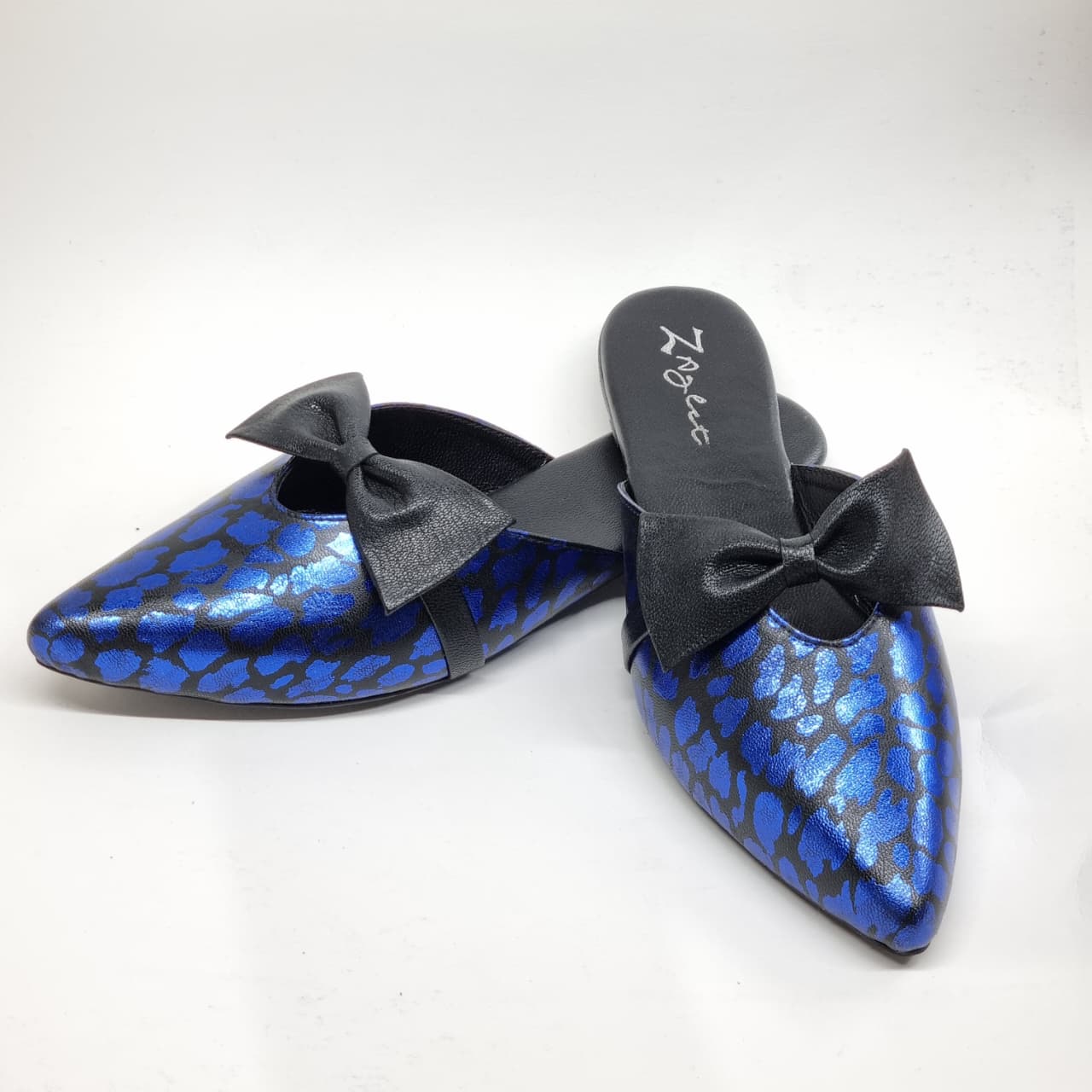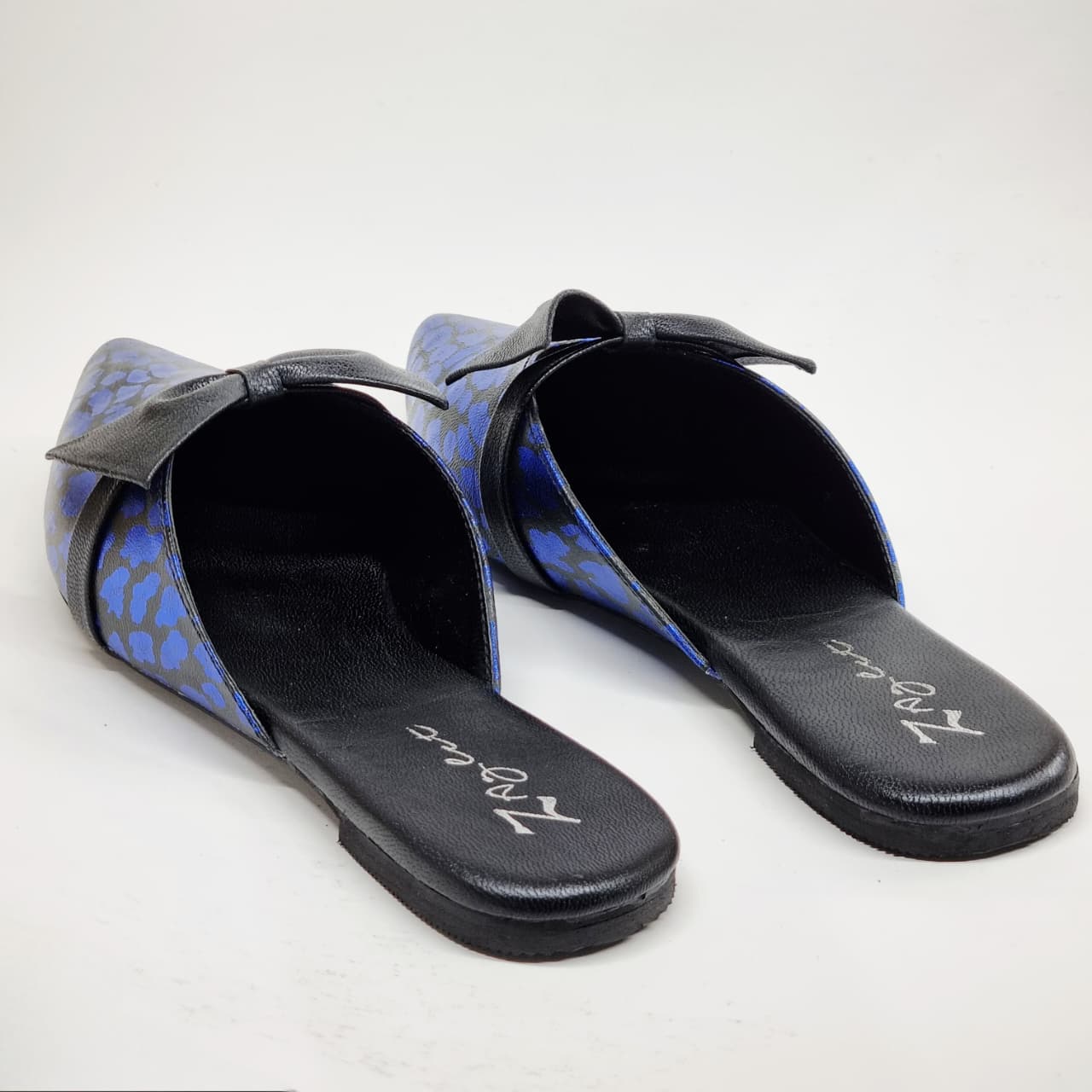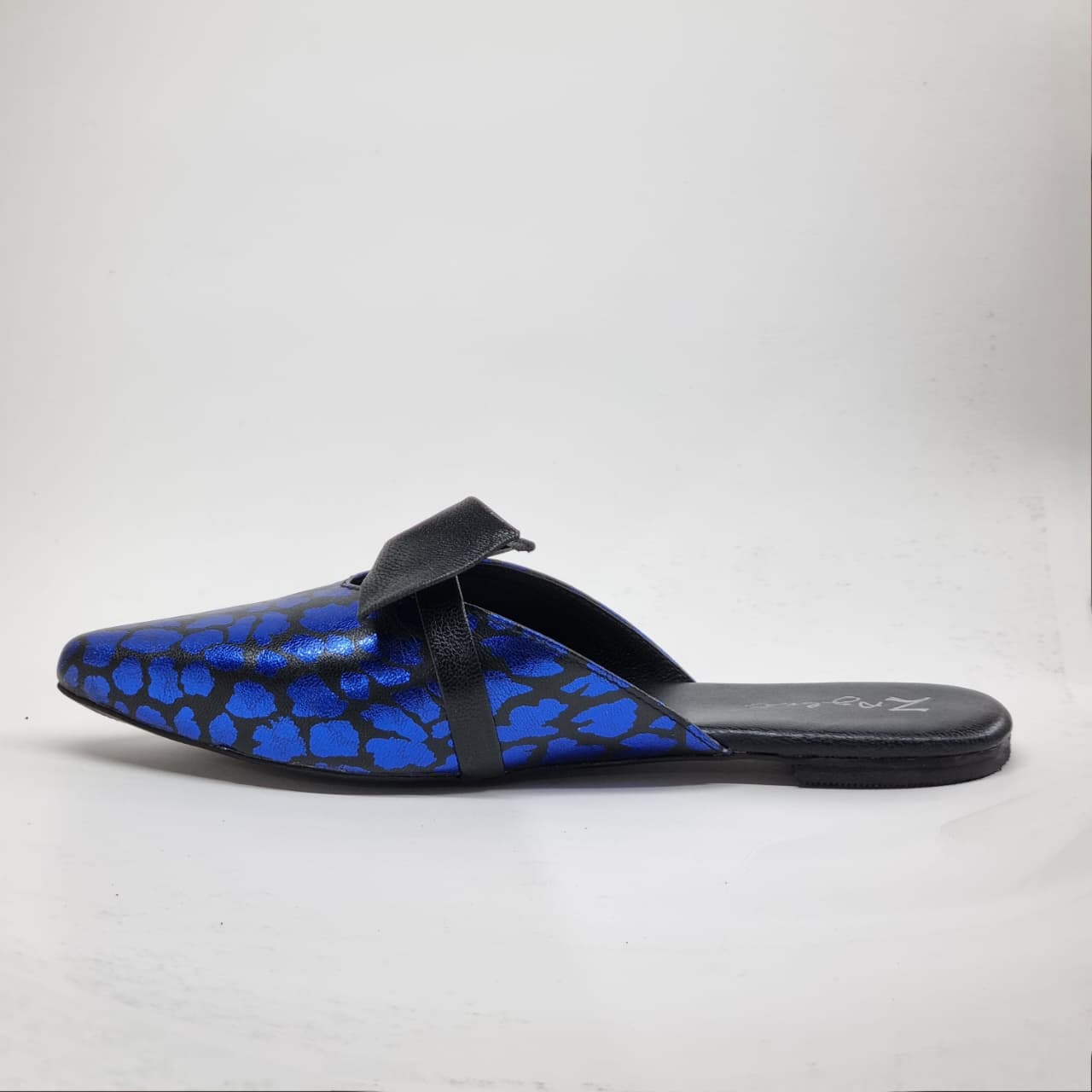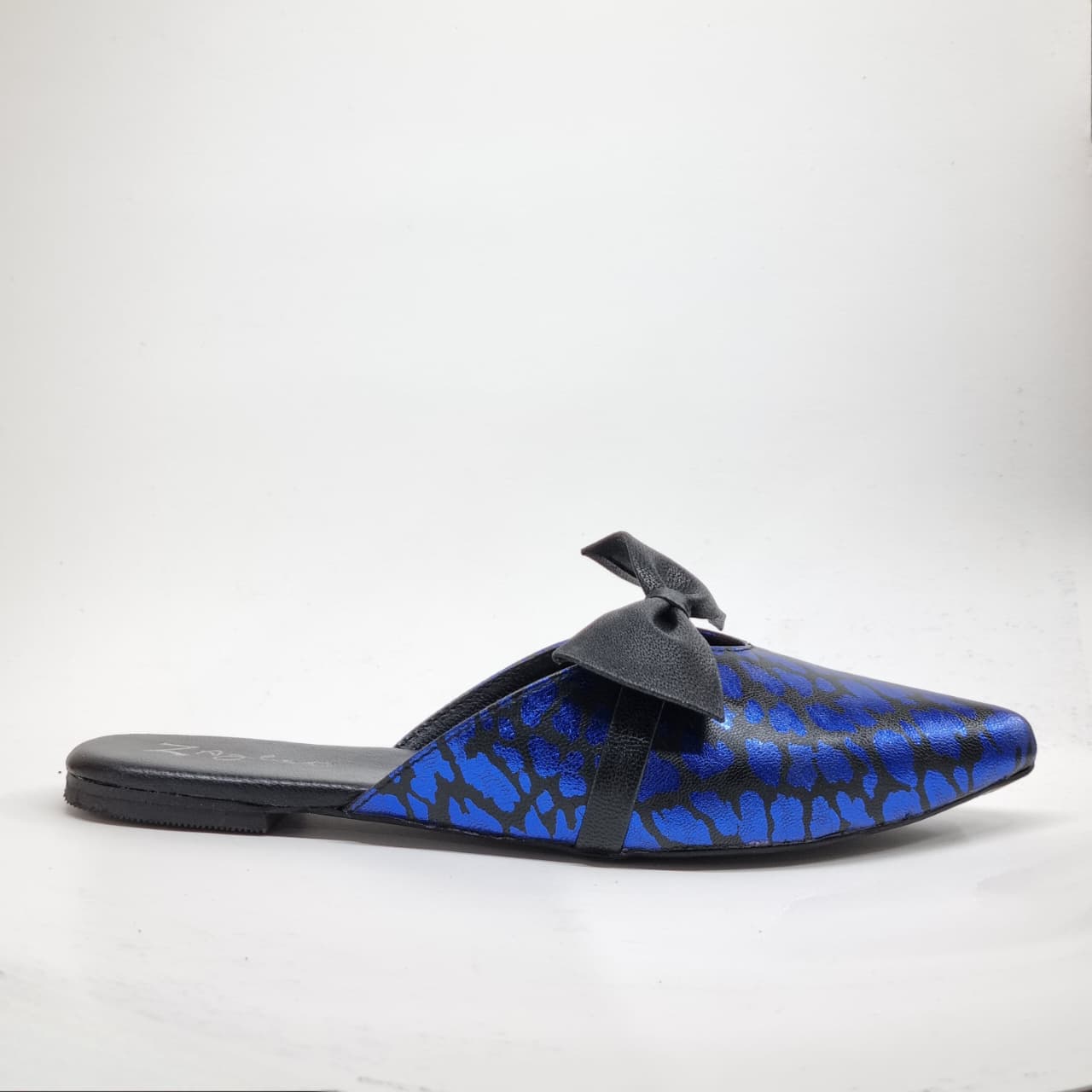 Deep electric blue leather with black feline emboss and a soft leather bow — bold, sculpted, and dangerously elegant. A pointed slip-on that balances playfulness with pure sophistication, made for nights that don’t go unnoticed.