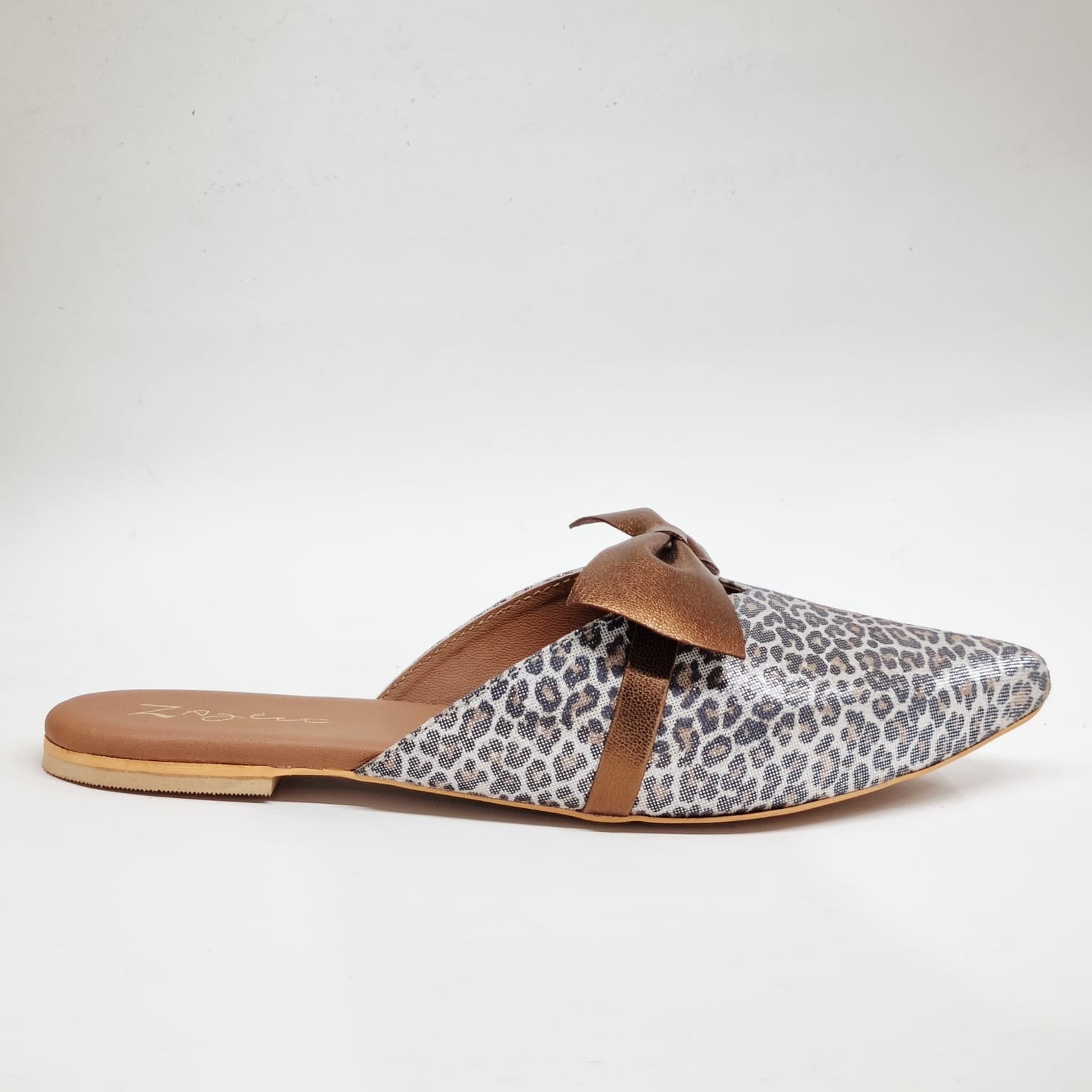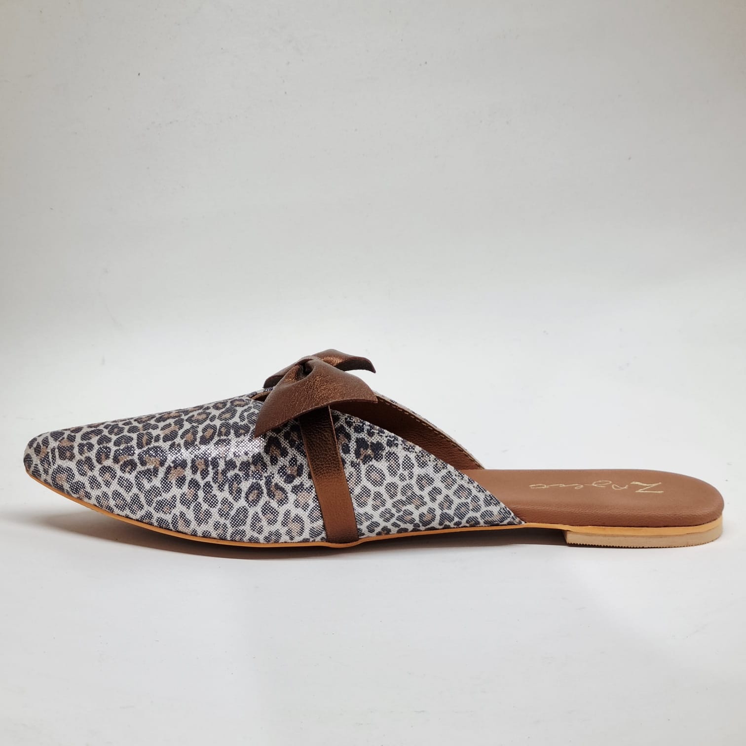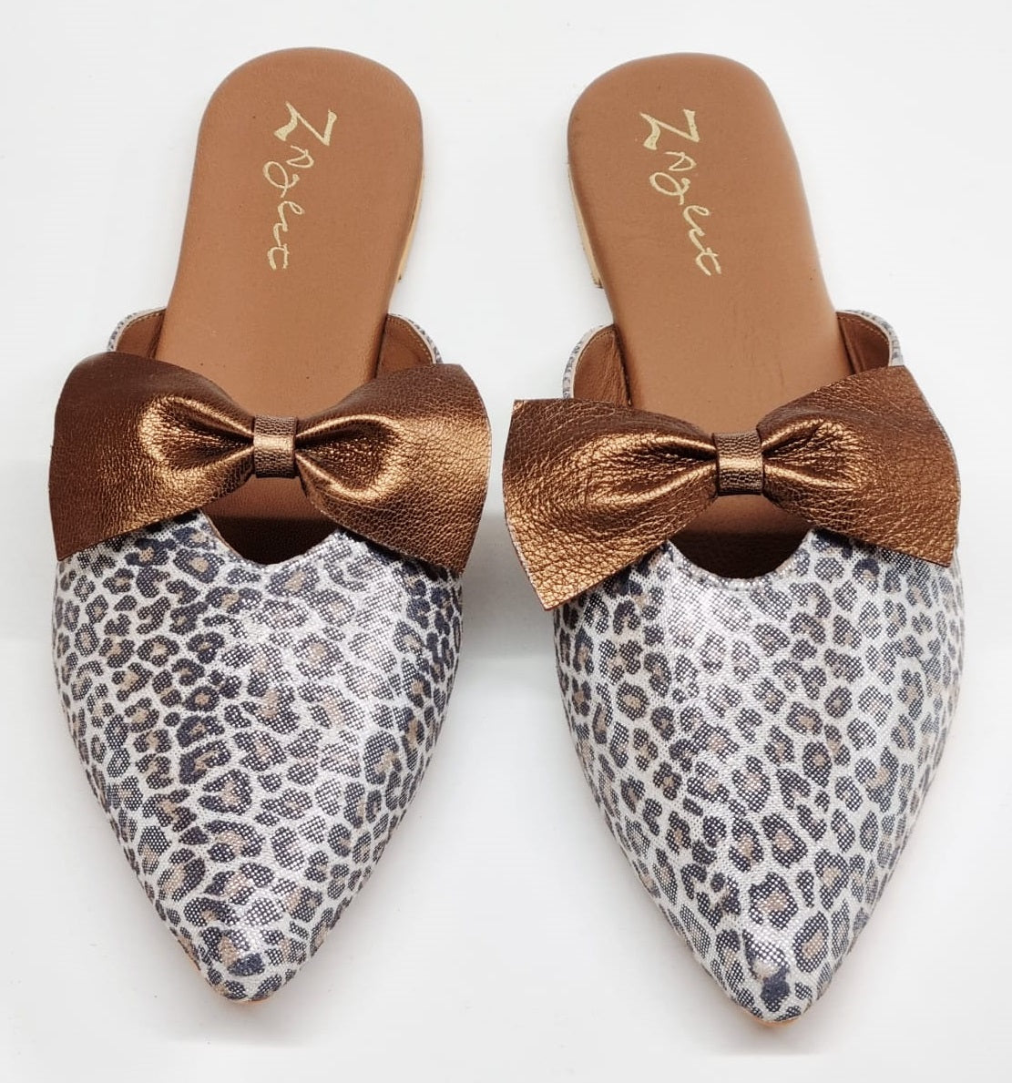 Luxe leopard-print leather with warm bronze undertones and a hand-tied metallic bow — playful yet poised, fierce yet feminine. A pointed slip-on that whispers confidence and radiates quiet glamour with every step.