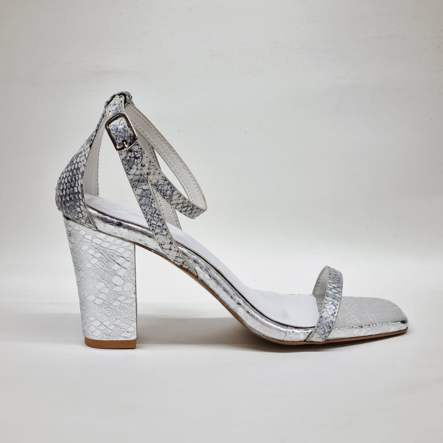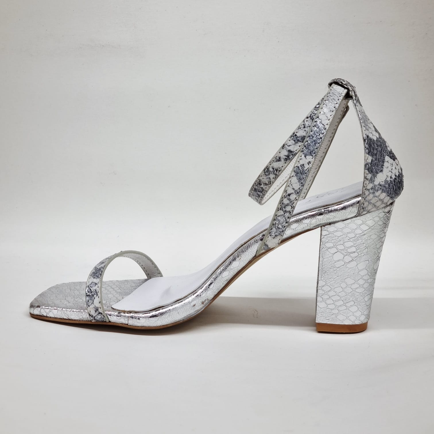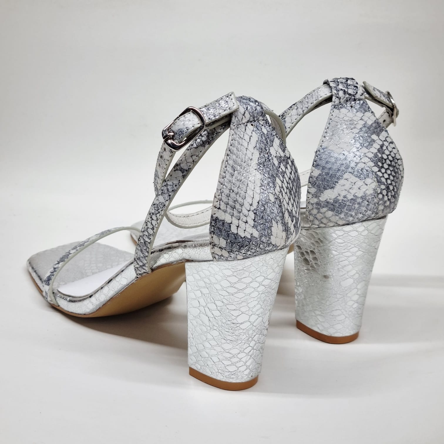 White-silver python-embossed leather with a whisper of frost — sleek, refined, and irresistibly poised. The slender straps and block heel exude quiet confidence — graceful by nature, magnetic by design, and made to turn every step into a statement.