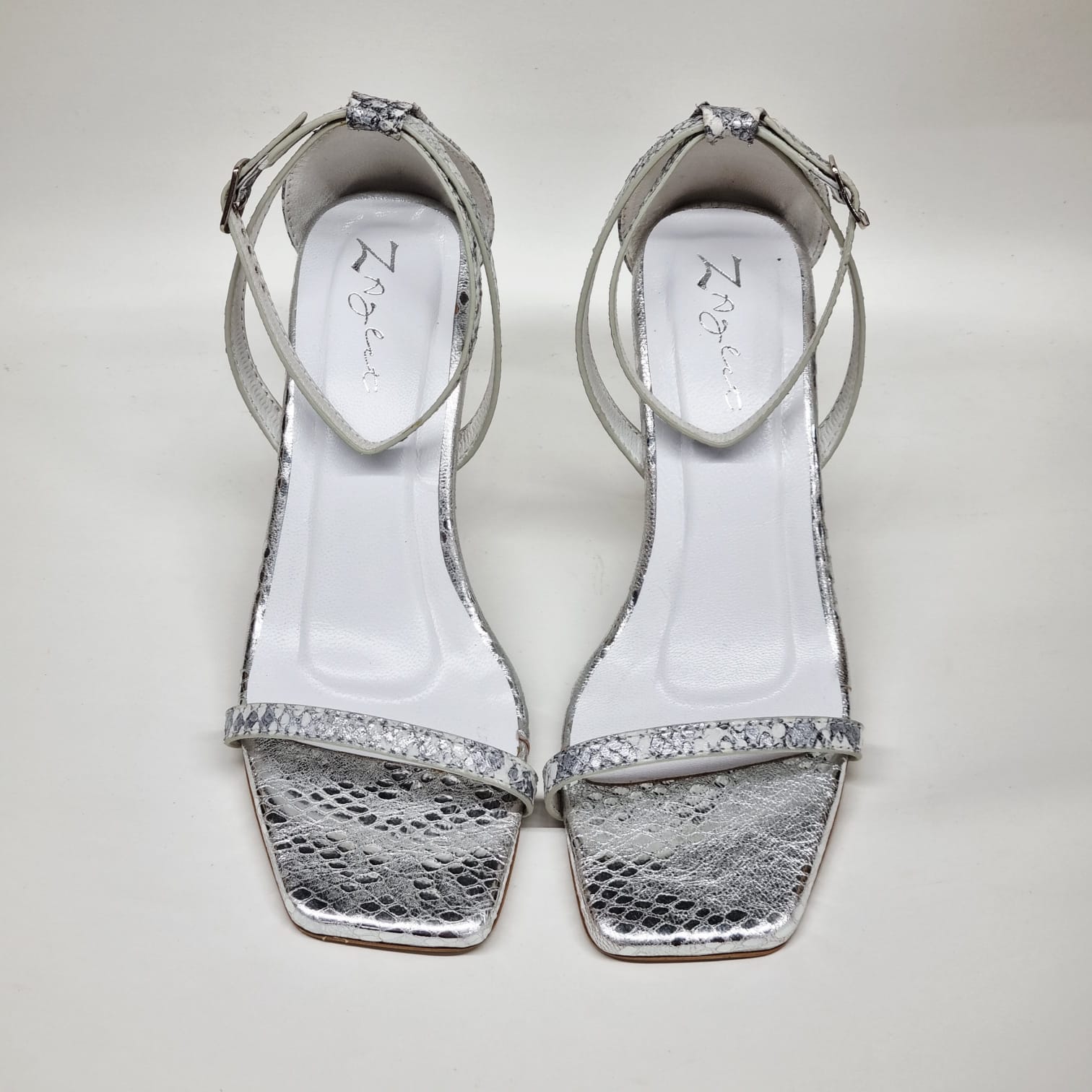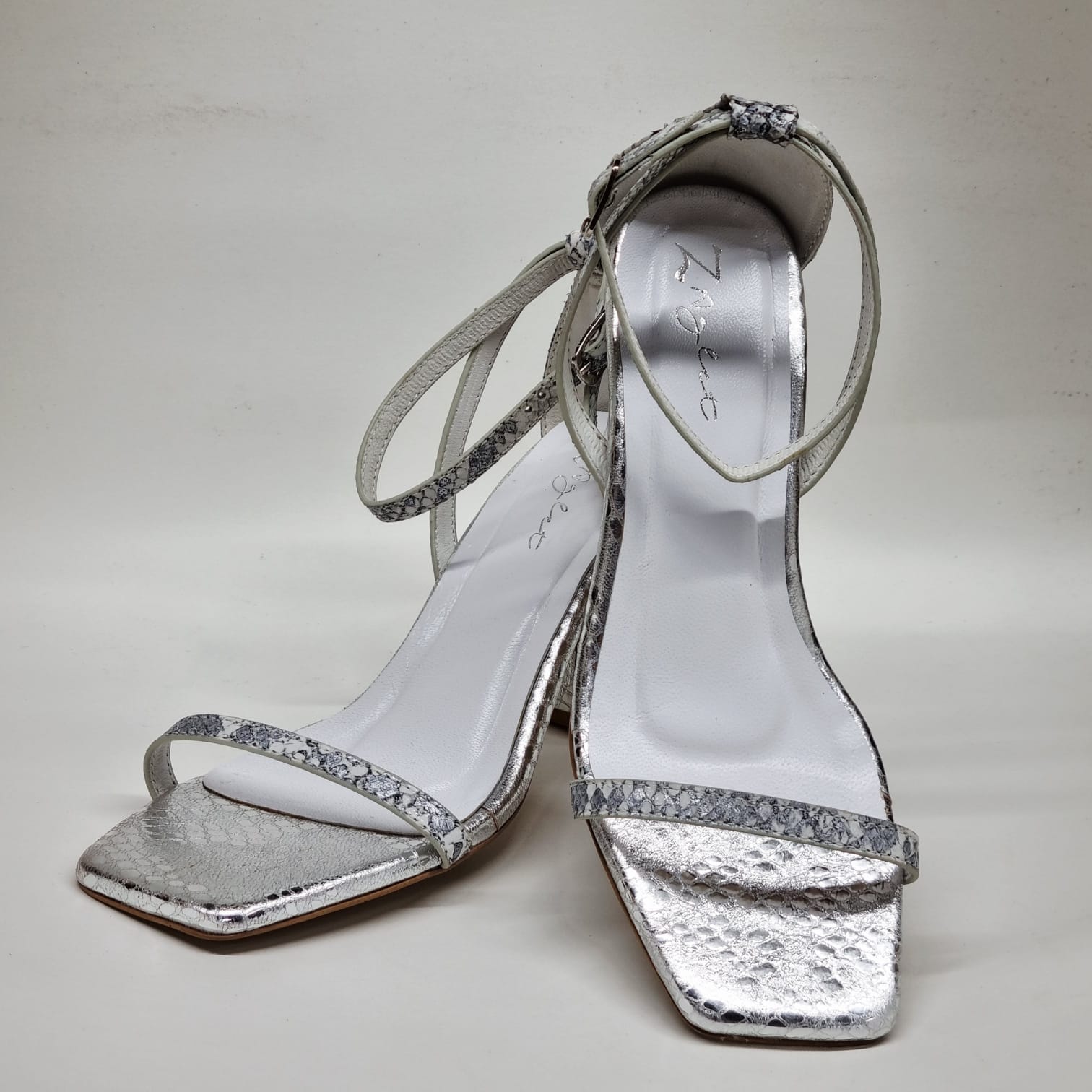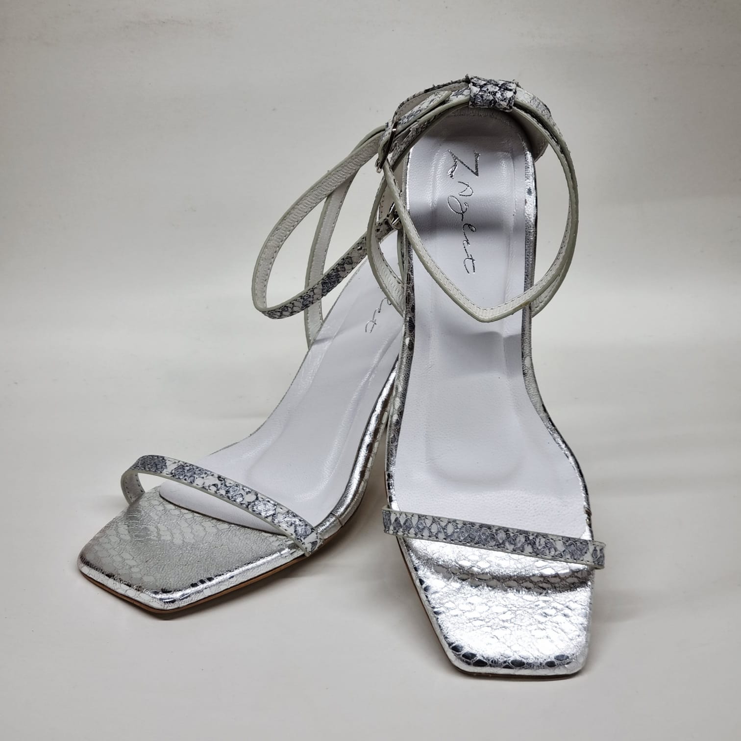 White-silver python-embossed leather with a whisper of frost — sleek, refined, and irresistibly poised. The slender straps and block heel exude quiet confidence — graceful by nature, magnetic by design, and made to turn every step into a statement.