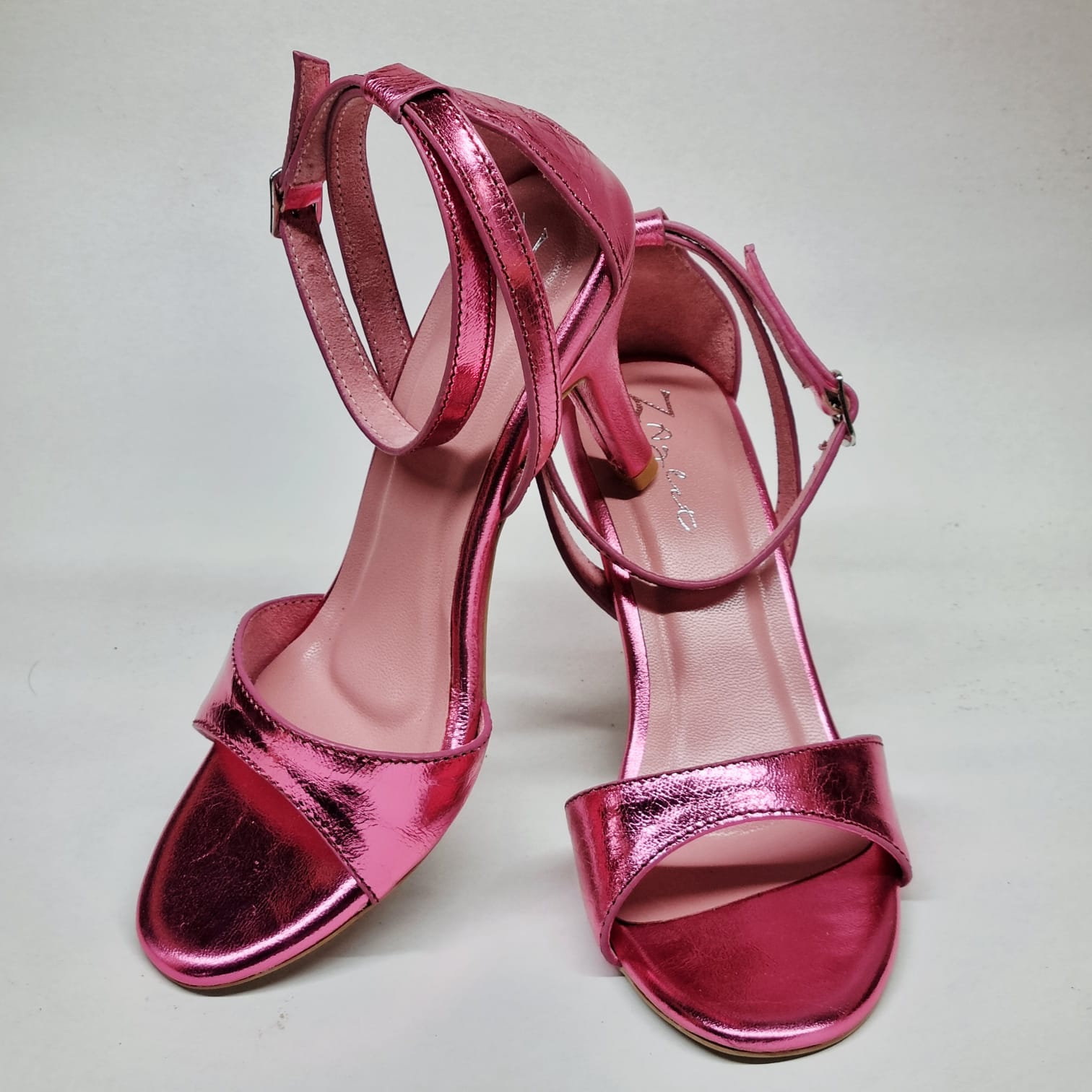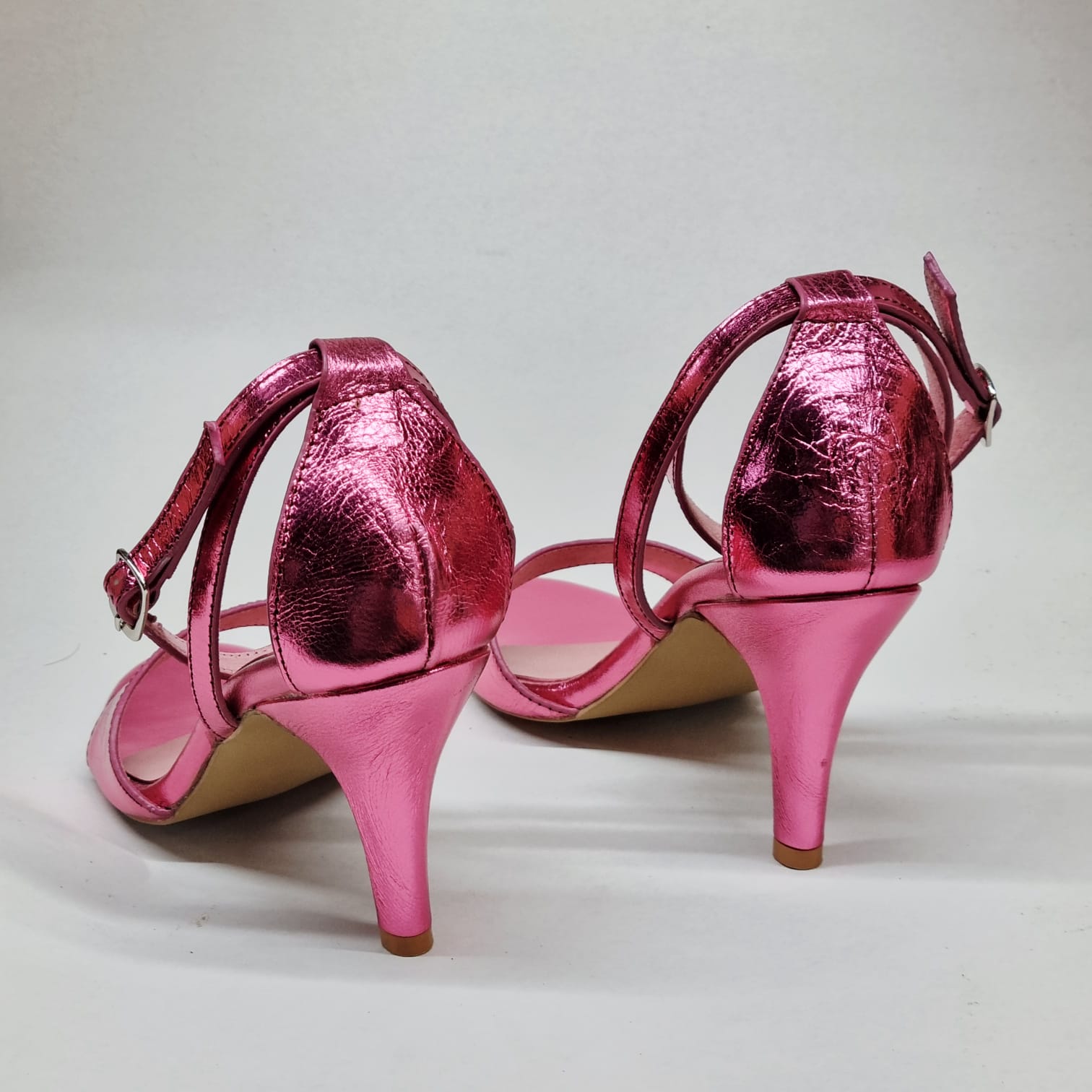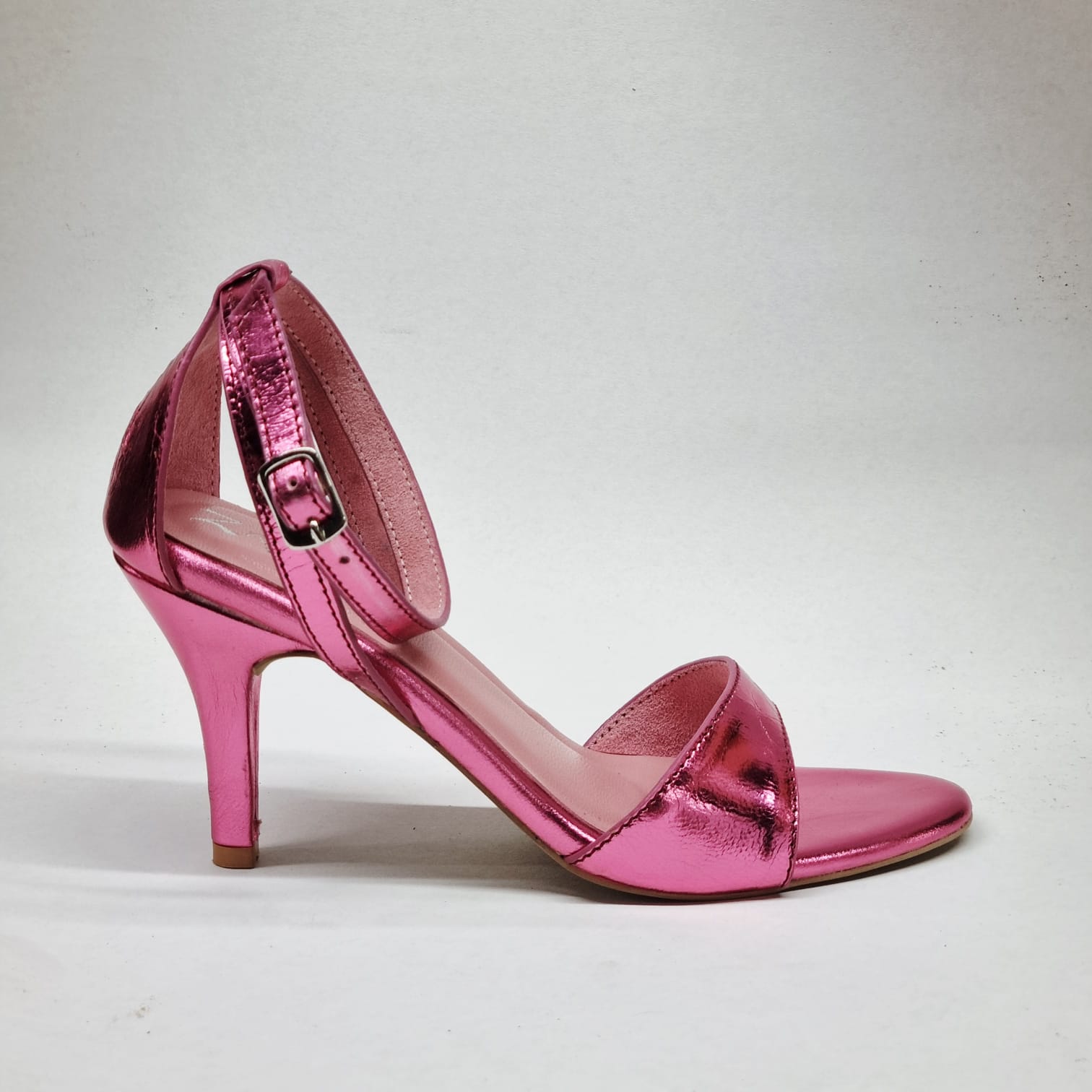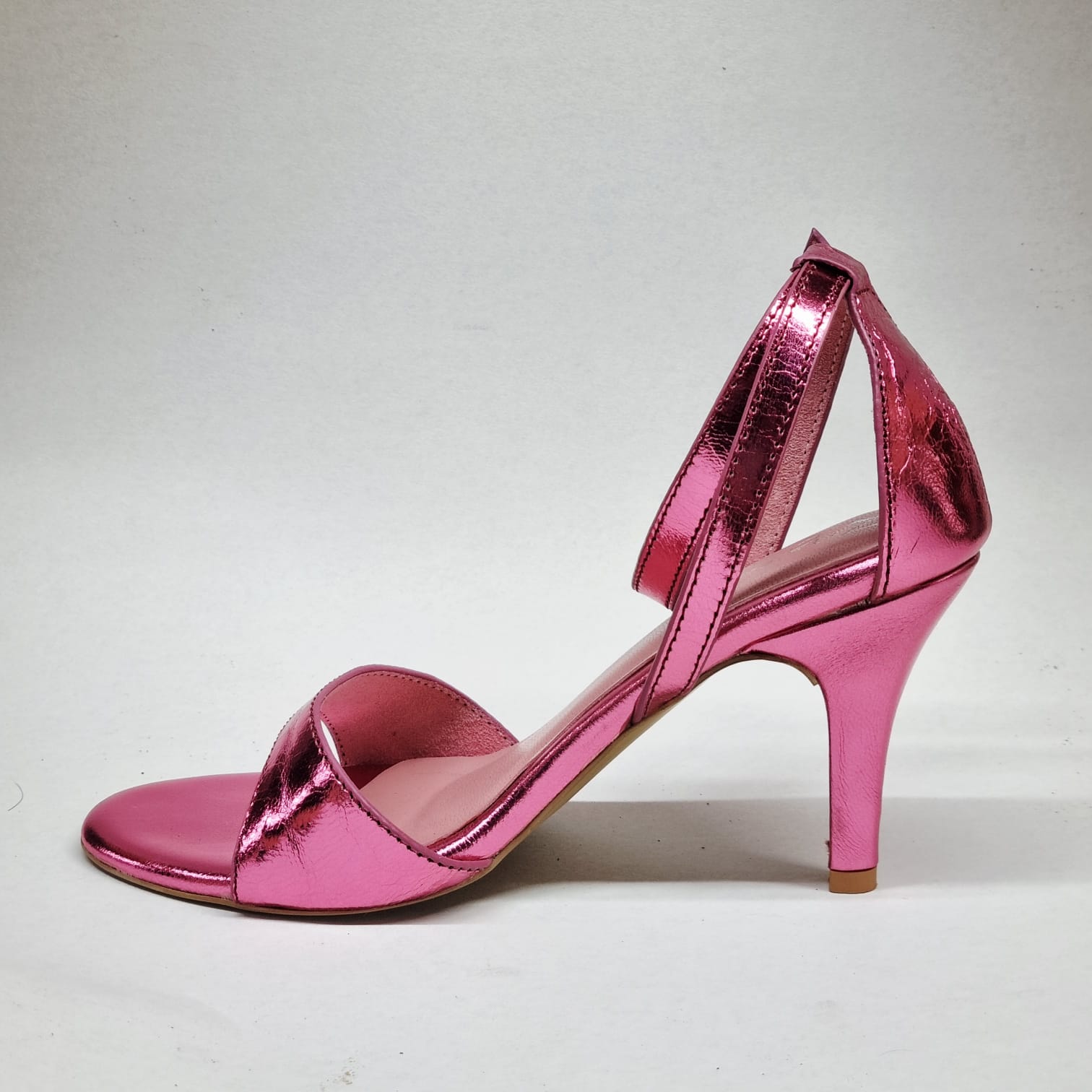 A glossy pink moment made for nights that don’t end early. Daisy pairs a clean, feminine silhouette with high-shine metallic leather that catches light—and attention—with every step. Sleek straps, a confident heel, and just enough drama to turn a simple outfit into a statement. Sweet from afar, bold up close.