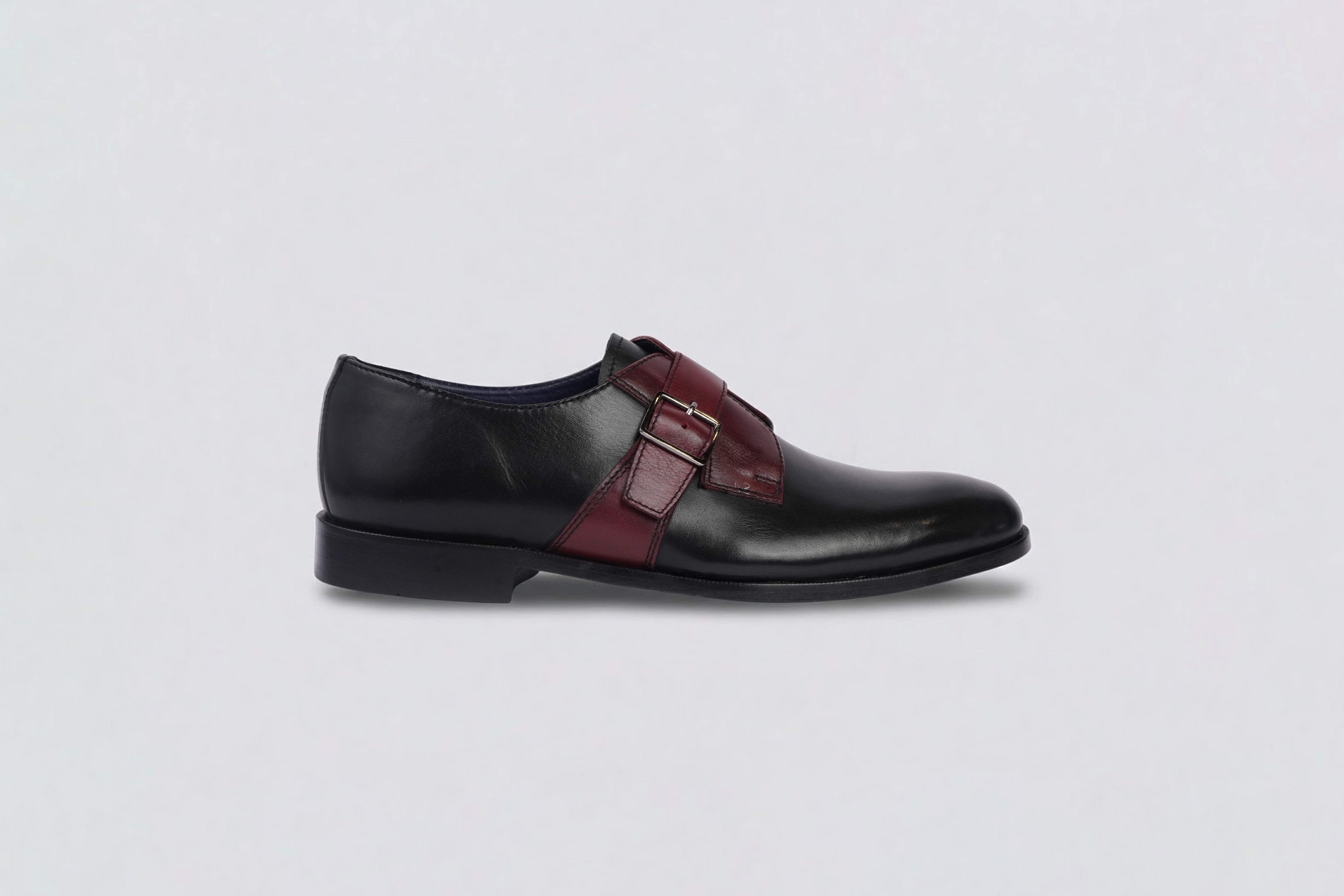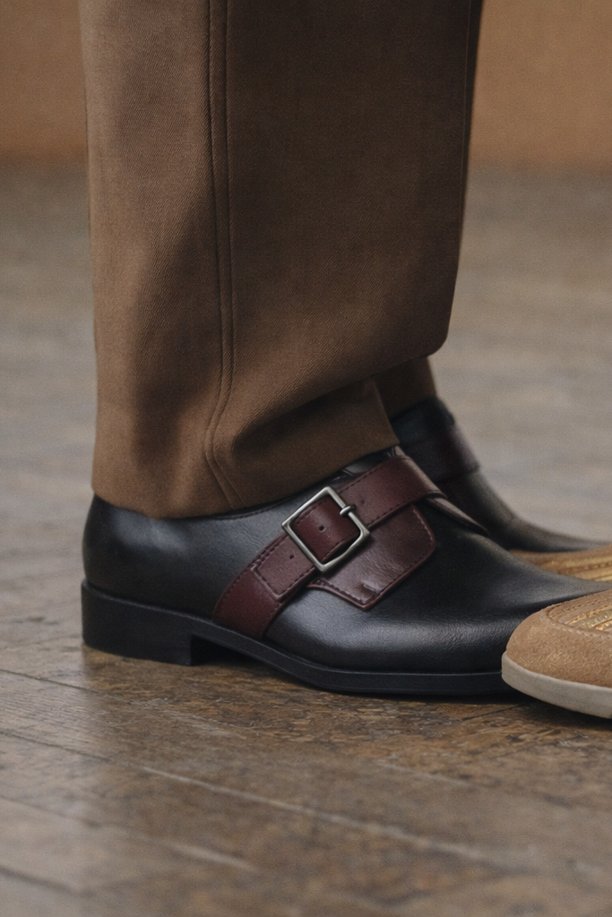 A modern monk strap with quiet authority. Smooth black leather forms the foundation, interrupted by a deep oxblood strap that feels deliberate, not decorative. The silhouette is clean, confident, and disciplined—made for men who appreciate contrast done with restraint. Vladimir doesn’t chase attention; it earns it through precision, balance, and a sharp sense of self.