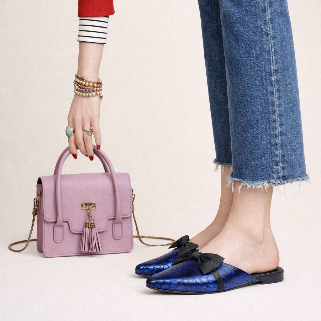 Deep electric blue leather with black feline emboss and a soft leather bow — bold, sculpted, and dangerously elegant. A pointed slip-on that balances playfulness with pure sophistication, made for nights that don’t go unnoticed.