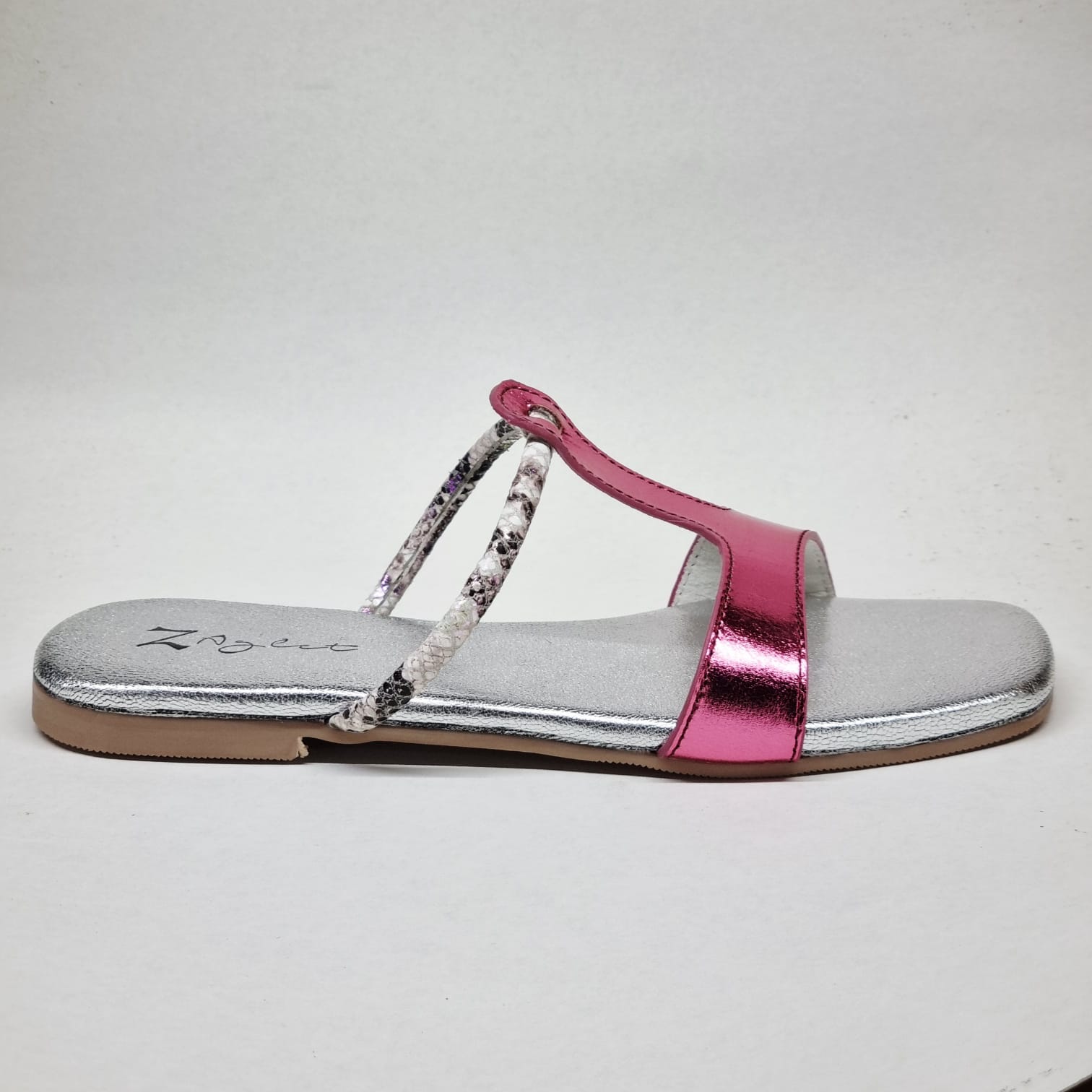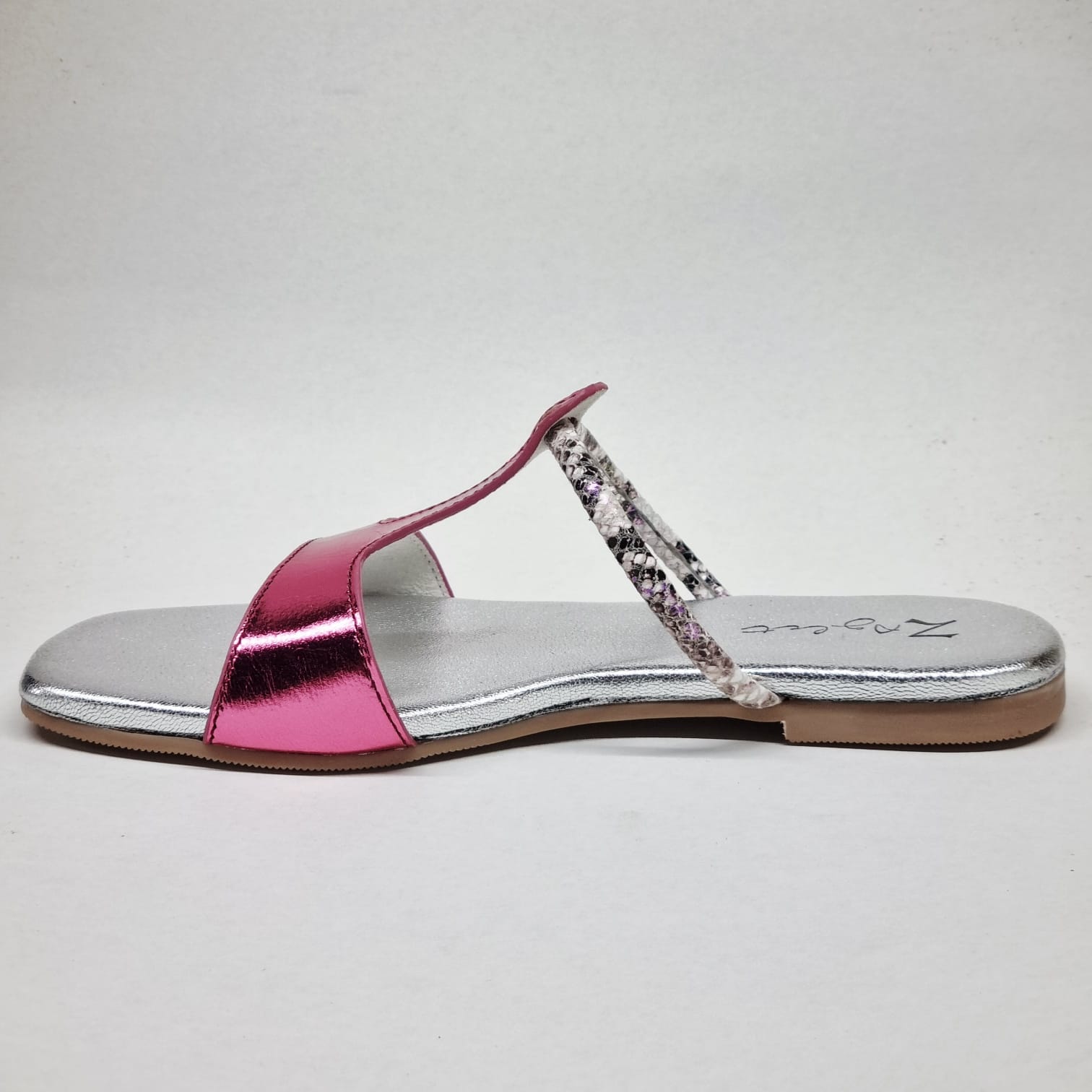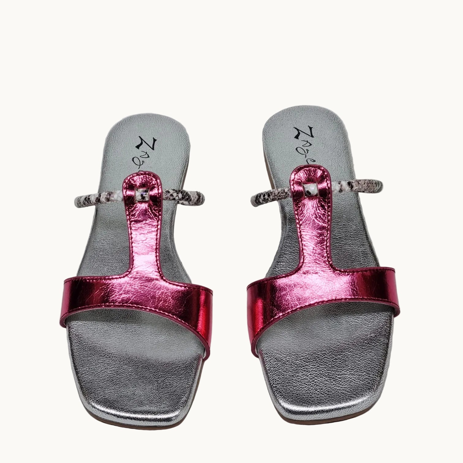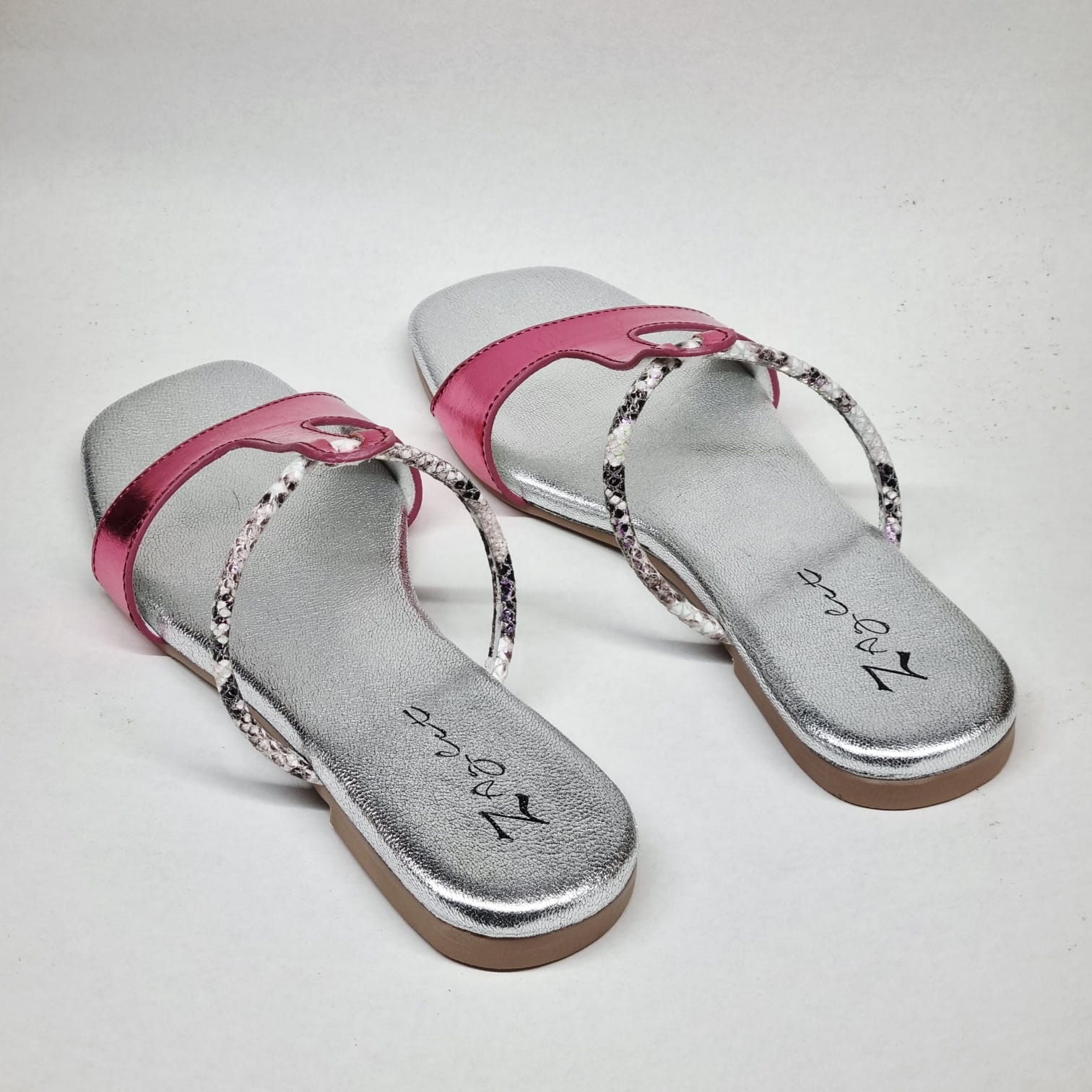 A confident pop of colour that feels straight off a runway after-party. High-shine pink leather slices through a cool silver base, while the slim textured strap adds just enough intrigue. Playful yet polished, this pair is made for nights that start casual and end unforgettable.