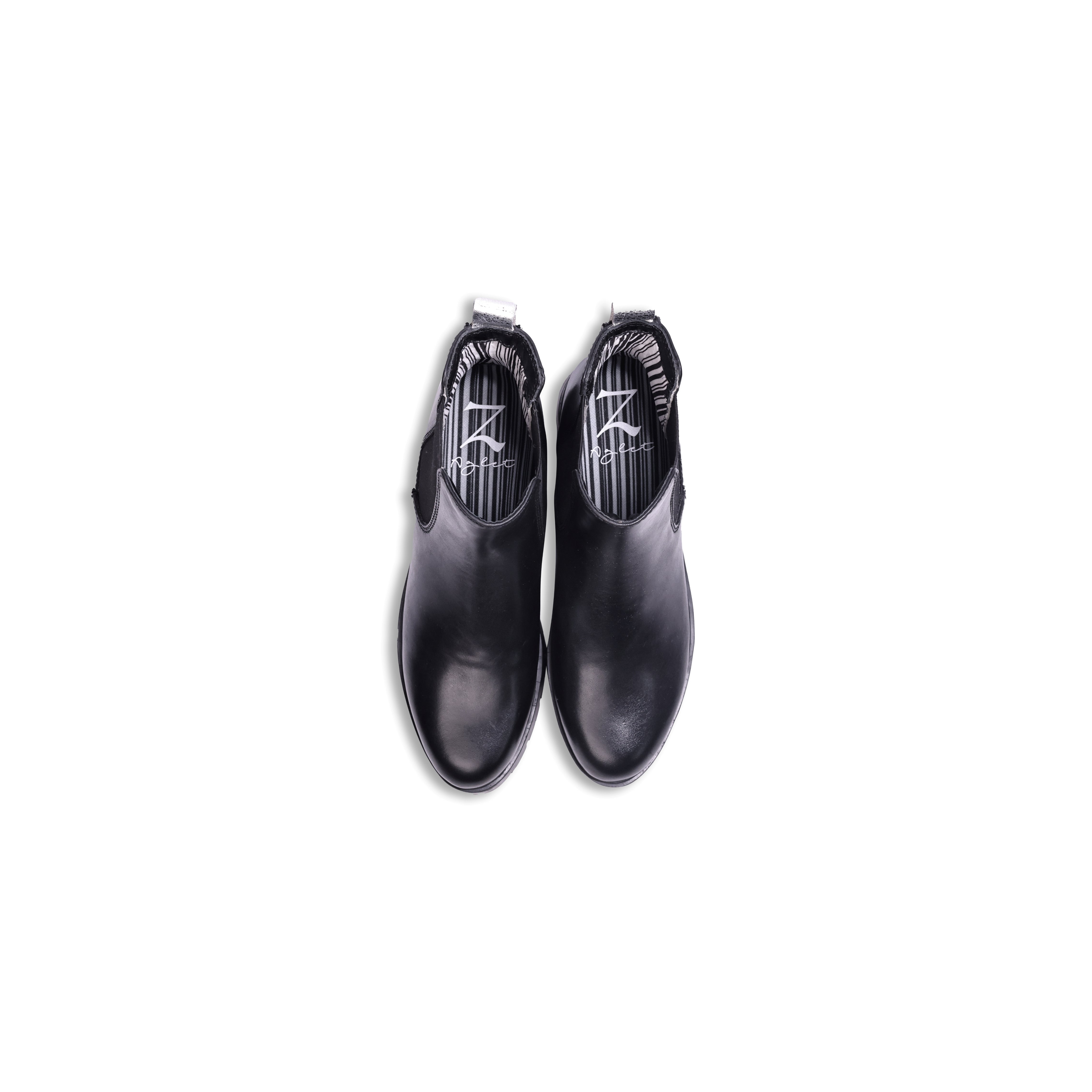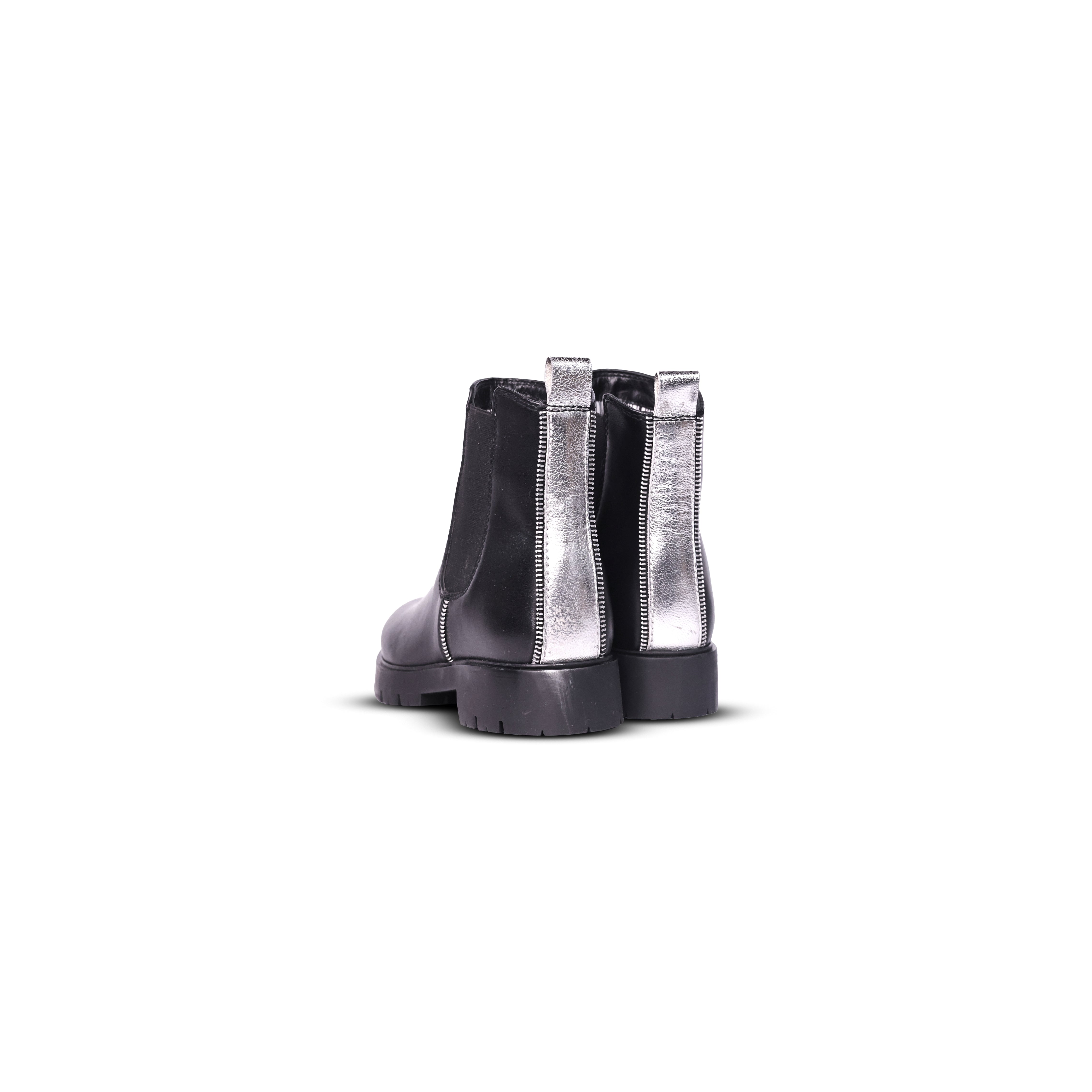 Black leather boots with a silver streak. Sleek zippers slicing up the side — part femme fatale, part runway rebel. Power dressing for your feet.